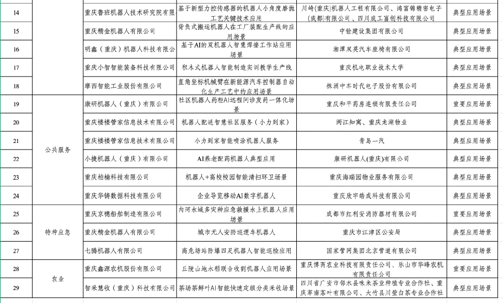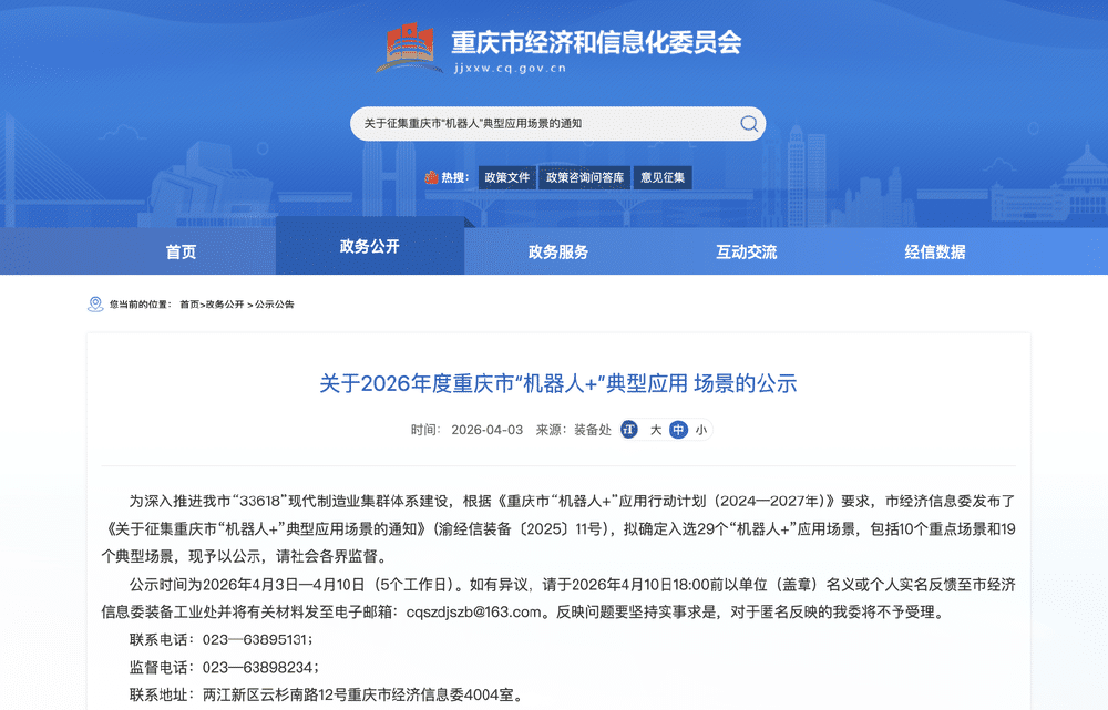 为推广一批具有较高水平、创新应用模式和显著应用成效的机器人典型应用场景,日前,重庆市经济信息委公示了“2026年度重庆市‘机器人+’典型应用场景”,拟确定29个“机器人+”应用场景入选,公示时间截止于4月10日。