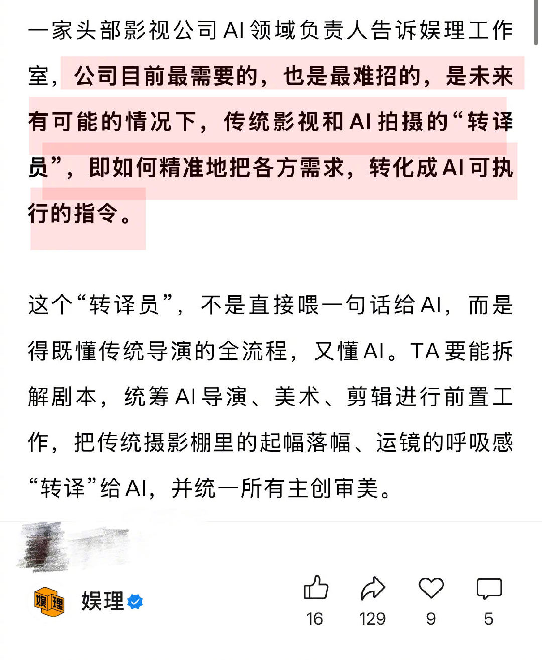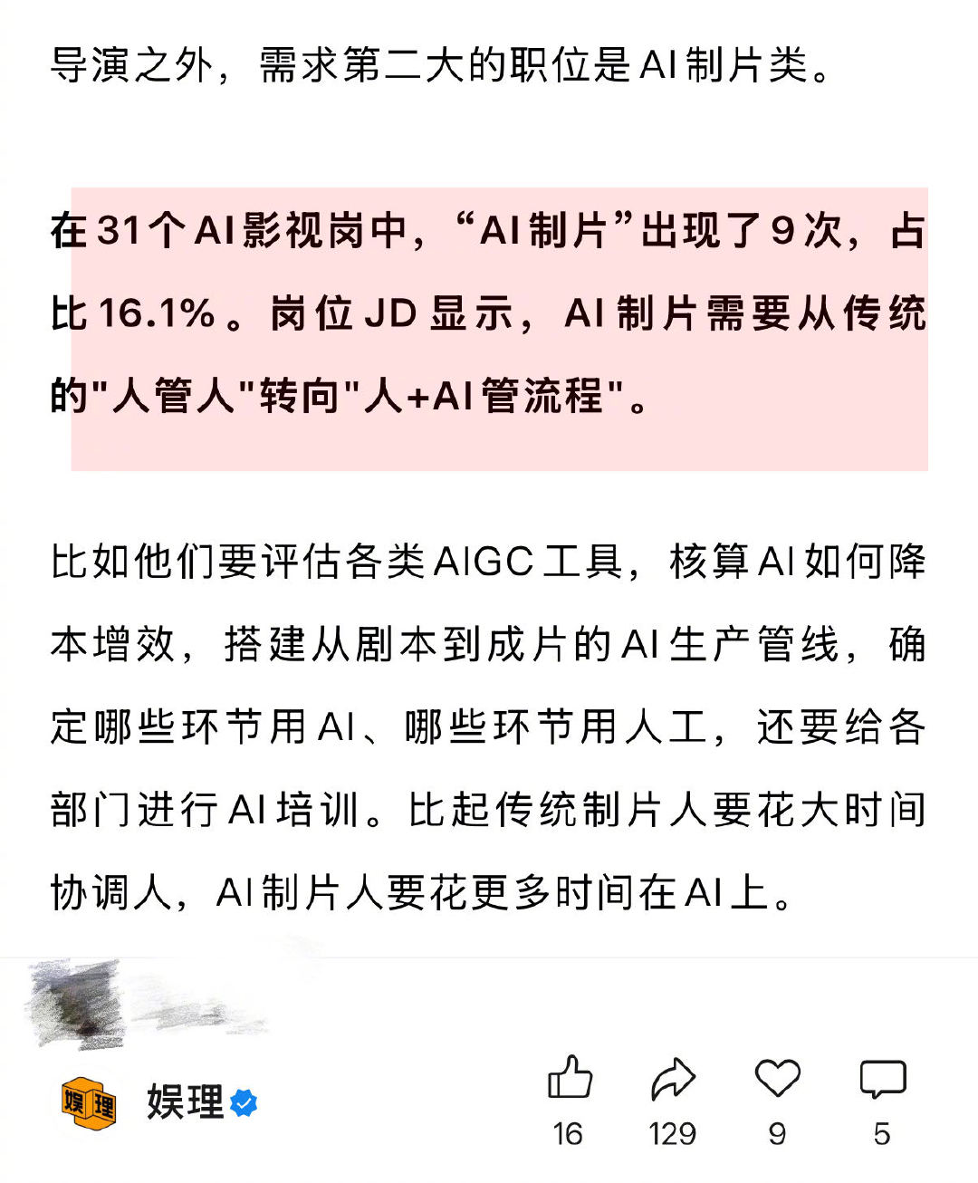AI导演成2026最火影视岗位 近八成企业要求员工AI能力 上海戏剧学院电影学院院长厉震林认为,随着将来的进阶发展,AI就像手中的笔,借助它,人人都可以写剧本拍电影。“导演不再称为导演,更接近于AI指令师的概念。”他强调,文艺界的重点竞争仍然是创意,,演员中心制或将慢慢变成剧本中心制。AI不会取代演员,但会有部分是AI生成的…