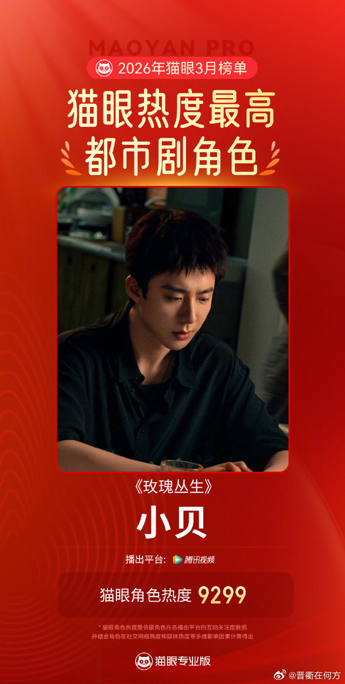 【刘宇宁小贝3月都市角色TOP1】刘宇宁小贝蝉联最热都市角色据数据, 在《玫瑰丛生》中饰演的“小贝”,成为2026年3月猫眼热度最高都市剧角色!此前,谈到自己出演《玫瑰丛生》中“小贝”一角的原因:一是想和导演学东西,二是想尝试新鲜的角色类型。刘宇宁还坦言,自己身上缺少“仙气”,更多的是“接地气”,所以不太适合出演仙侠类剧集。打卡衢州