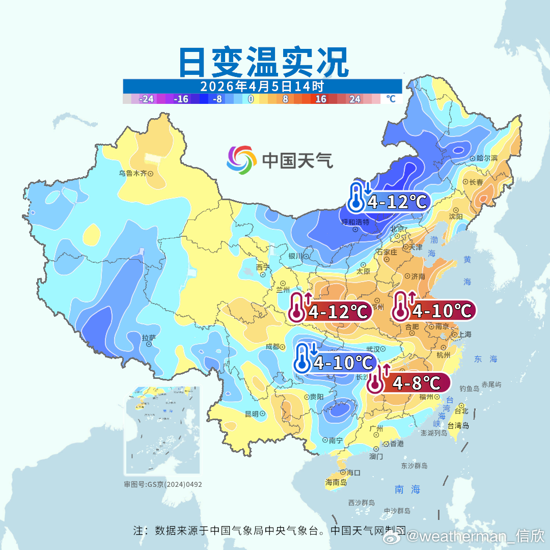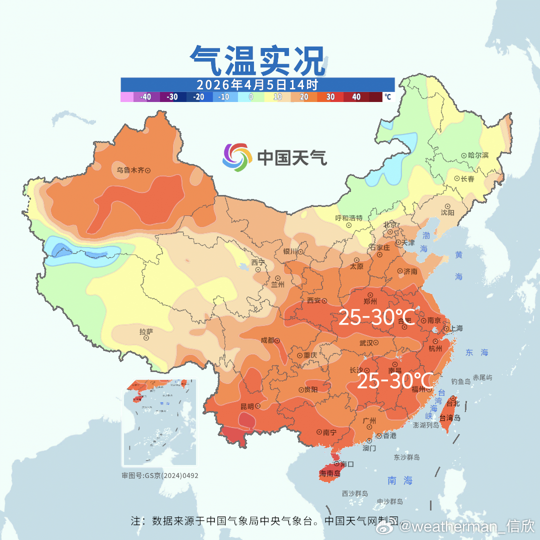 【气温】今天因为冷空气影响,内蒙古多地出现4-12℃降温。而华北南部到江南多地气温上升,黄淮到江南一带气温超25℃,截至15时最高,部分城市气温接近30℃,创今年新高,比如:郑州29.8℃、合肥29.4℃、杭州29.1℃、南京29℃、南昌28℃、上海徐家汇26.5℃。此外今天云南干热河谷和海南岛多地出现高温。截至15时最高,海南澄迈38.4℃,暂列第一。