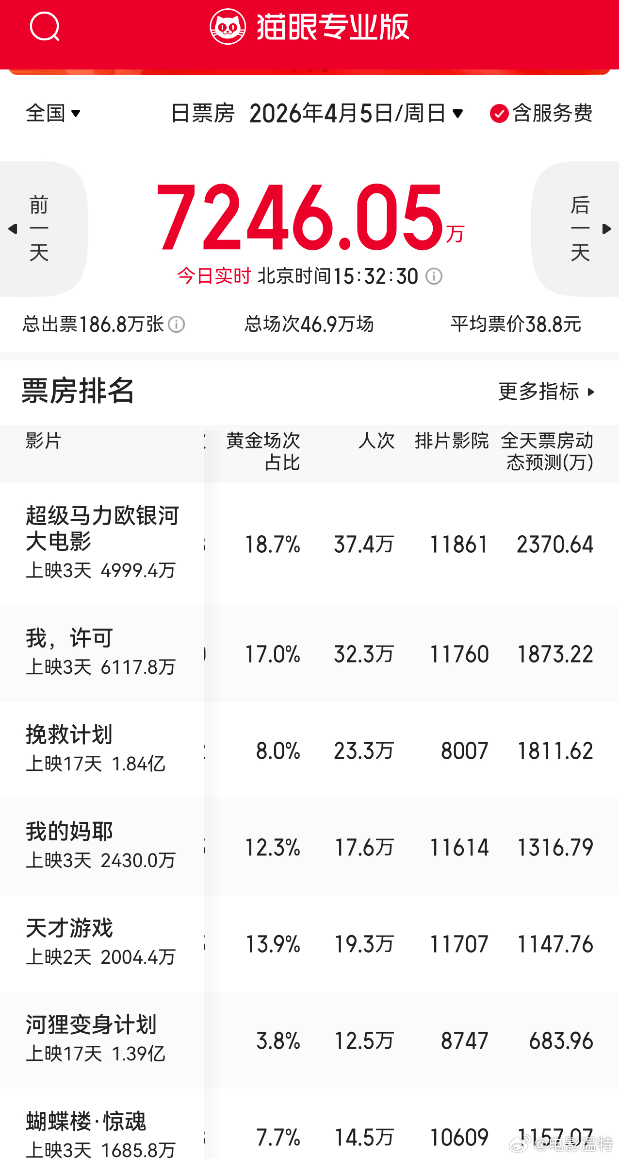 听听温特怎么说 今天票房要逆跌了,按照猫眼专业版预测《马里奥》《我许可》《挽救计划》《我的妈耶》《蝴蝶楼·惊魂》《河狸变身计划》集体逆跌!其中《挽救计划》《蝴蝶楼·惊魂》逆跌最猛!今年清明档3亿票房还是有希望的。
