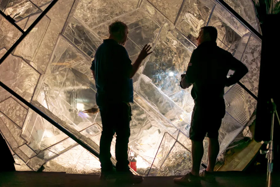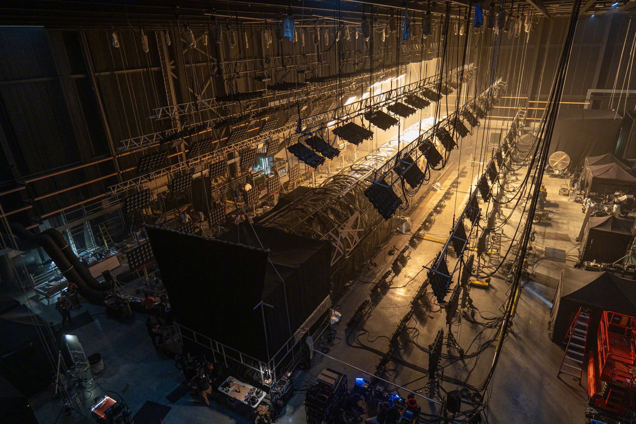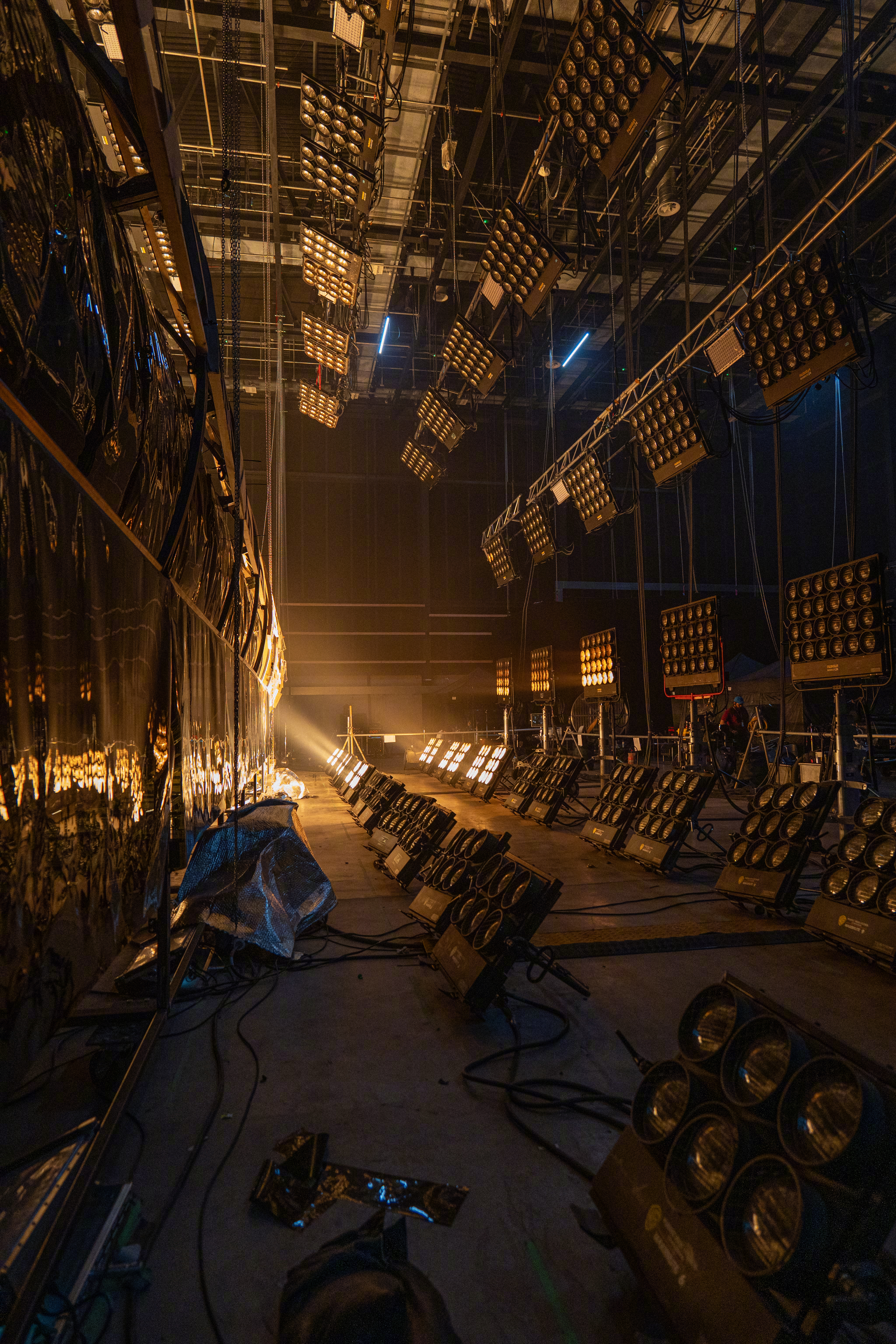 最终团队选择了一条很复古的路:放弃LED,改用大量老式钨丝灯,并通过像素映射控制光源运动,让“太阳”可以在空间中自由旋转、移动,形成一种真实且可控的光照效果。