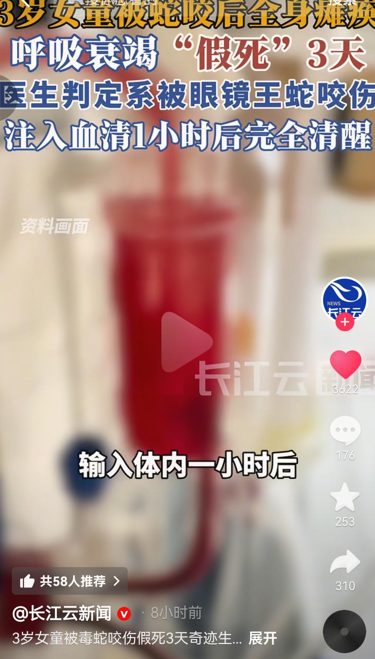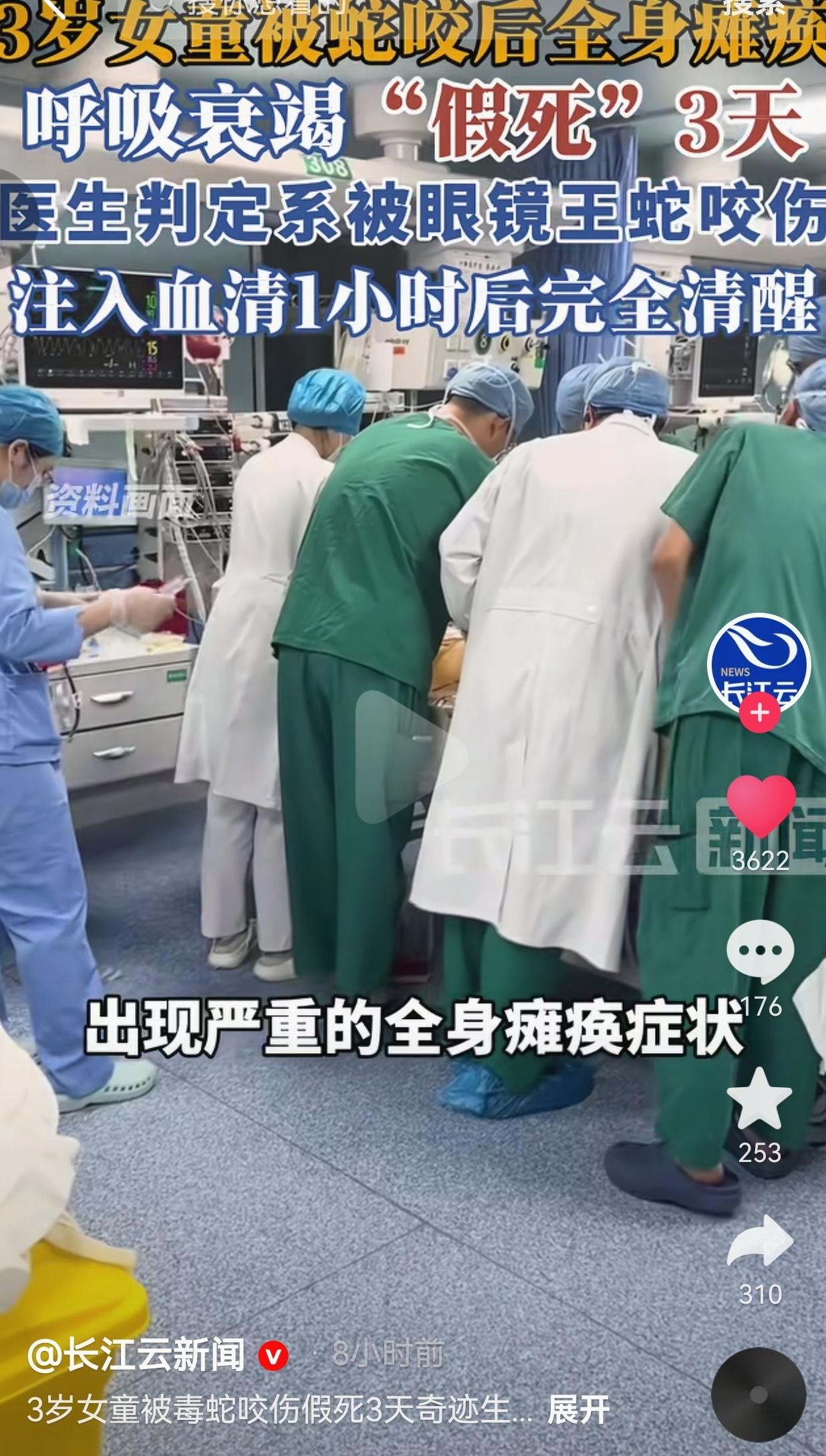 泪目了!3岁小女孩被剧毒眼镜王蛇咬伤,全身瘫痪、呼吸衰竭,整整“假死”3天,最后靠医生全力抢救,打了抗蛇毒血清1小时后,竟然完全清醒、奇迹生还!这才是生命的奇迹,这才是医者仁心! 近日,云南一名3岁女童在家中,不慎被剧毒蛇咬伤。仅仅半小时后,孩子就出现了严重的全身瘫痪,紧接着呼吸衰竭,直接陷入了“假死”状态!医生初步判断,咬人的是我国毒性最强的蛇之一——眼镜王蛇! 孩子的情况急得要命,家长抱着孩子先后辗转广西百色、南宁多家医院抢救。 可眼镜王蛇的毒性有多猛?它的毒液是致命的神经毒,一旦发作,会直接麻痹呼吸肌,让人彻底失去自主呼吸,全身肌肉瘫痪,跟“死了”没两样! 医生后来也明确说了:孩子之前根本不是普通昏迷,而是神经毒导致的严重肌无力,整个人看似毫无反应、如同昏睡,实则是被毒液封死了所有行动和呼吸的能力,全靠呼吸机吊着一口气! 整整3天,孩子就靠着呼吸机维持生命,全身动不了、没意识,家长在外面哭到崩溃,所有人都以为孩子救不回来了。 可医生们从来没放弃!3天后,医生给孩子注射了足量的抗蛇毒血清! 谁能想到?仅仅1小时后,奇迹发生了!原本“假死”的孩子,竟然完全清醒了过来!瘫痪的身体慢慢恢复自主活动,呼吸也重新自主,硬生生从鬼门关被拉了回来! 这是什么?这就是医学的力量!这就是医生们不放弃每一个生命的奇迹! 评论区直接炸了,全是感动和祝福,有的网友说:“我的天!太惊险了!还好医生没放弃!这孩子命大,医生医术更高!祝小朋友彻底康复,健康长大!” 也有的网友说:“眼镜王蛇啊!这玩意儿咬一口成年人都扛不住,3岁小孩能活下来,简直是医学奇迹!给医生们跪了!” 还有的网友说:“看哭了!家长这3天得有多煎熬?还好没放弃!医生是真的天使,硬生生把孩子从死神手里抢回来了!” 也有的网友说:“提醒所有家长!尤其是南方的,家里一定要做好防蛇!小孩不懂事,太危险了!” 我真的越看越感慨!眼镜王蛇,号称“蛇中之王”,一口毒液能毒死一头成年大象,3岁小孩被咬,能活下来的概率,简直是万中无一! 这不是什么运气,是医生们3天3夜不眠不休的坚守,是精准的判断、及时的血清、全程的监护,硬生生把孩子从死亡线上拉了回来! 我太懂那种绝望了!孩子没呼吸、没意识,全身瘫痪,家长在外面哭天抢地,换谁都觉得天塌了。可医生们没有放弃,他们知道,只要多撑一秒,孩子就多一分希望! 更让人感动的是,孩子醒过来的那一刻,所有的努力都值了!这就是医生这个职业最伟大的地方:他们对抗的是死神,守护的是一个个家庭的希望! 目前,患儿的各项生命体征已经完全平稳,后续只需要慢慢康复,就能像正常孩子一样长大。 同时我也必须提醒所有家长!尤其是南方山区、农村的,春夏是蛇类活跃的季节,一定要看好孩子!家里做好防蛇措施,不要让孩子单独在草丛、角落玩耍!一旦被蛇咬伤,第一时间送医,不要耽误! 生命从来都有奇迹,但奇迹,永远属于不放弃的人!属于每一位拼尽全力的白衣天使! 最后我想说:所谓奇迹,不过是有人拼尽全力,不肯放弃每一个生命!