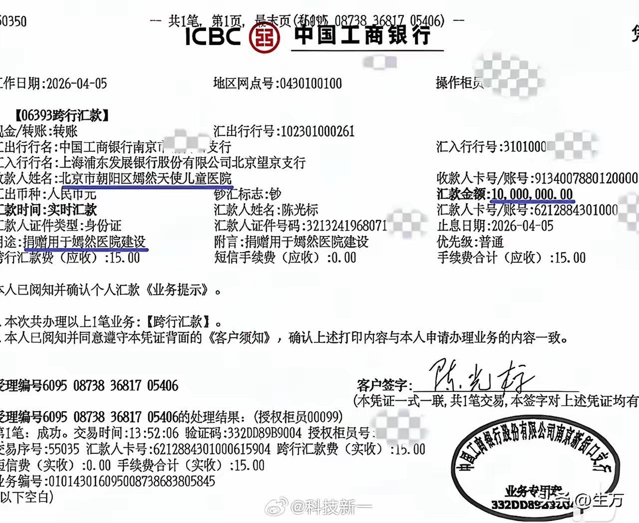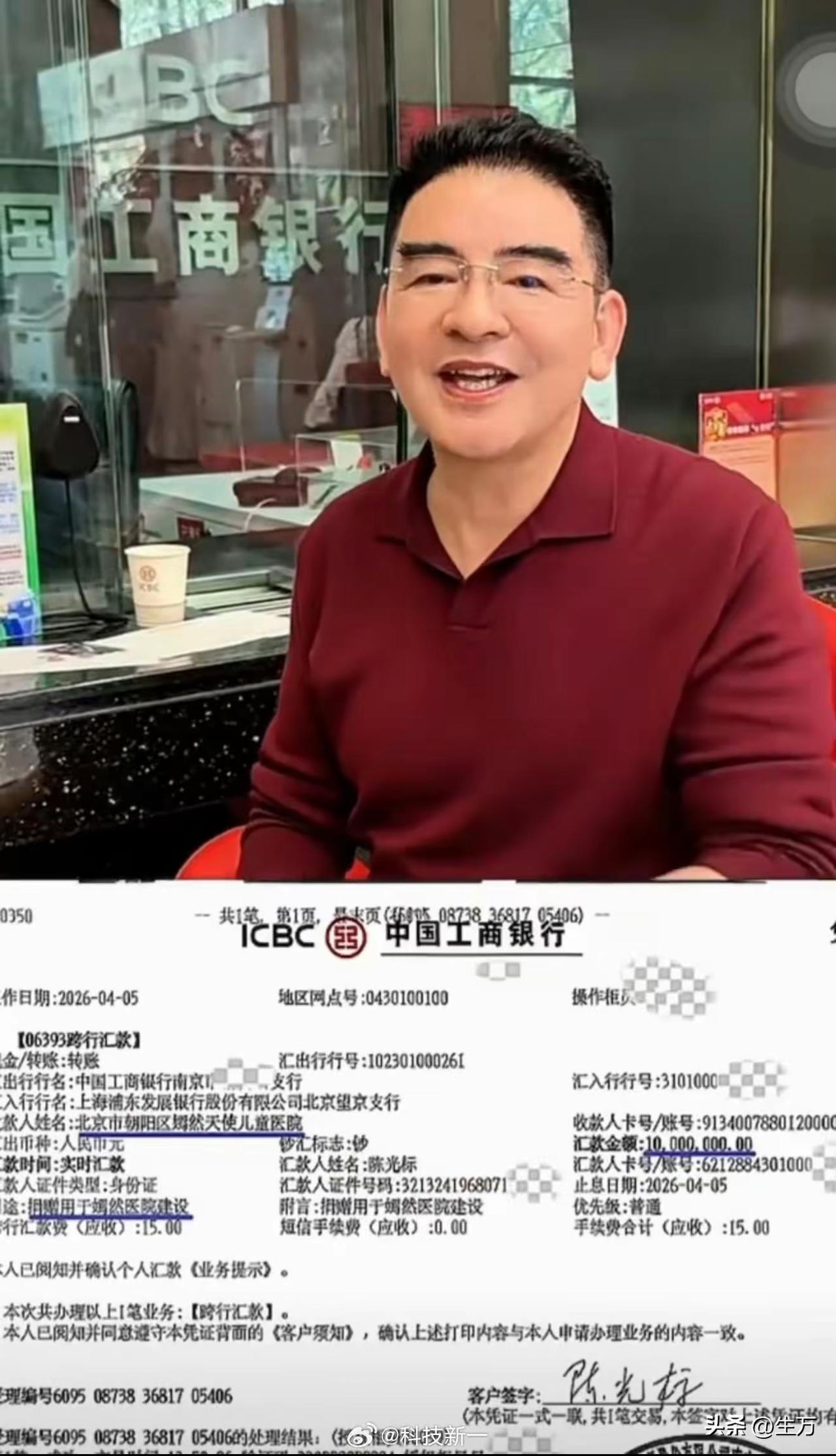 陈光标穿一身红衣服,晒出一张1000万的汇款单——那辆之前说要捐的劳斯莱斯,真卖了,钱直接打给了嫣然天使医院!他还解释:“张雪太忙,一直没来提车,我就干脆变现捐了。” 但说实话,这波操作怎么看都像“迫于舆论压力,不得不来了一把真实的!!也遮不住既往无数次靠诈捐行为博取的流量利益!!”事情原本是:先说要给嫣然捐款,没动静;后来说送张雪豪车,结果张雪公开表示要拍卖车辆做公益,反手将了一军。事闹大了,才改成现在这样——等于承诺捐两次,最后只兑现一次。 所以啊,这件事如果是真的,张雪的功劳,然后广大网友的舆论的功劳,最后感谢出资人陈光标!一鱼两吃,李亚鹏真该感谢张雪,不然这1000万,还真不一定能到账。