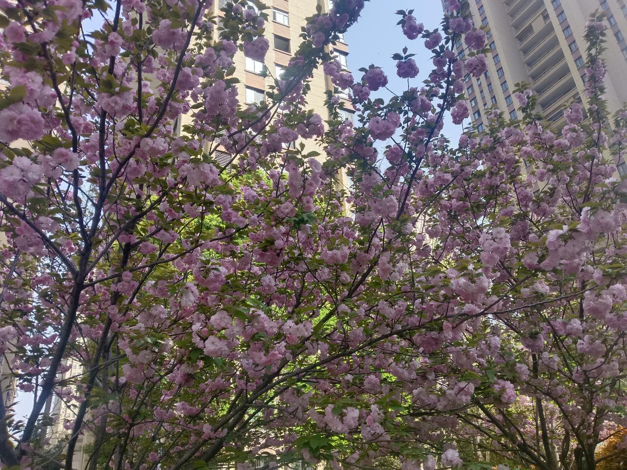 给大家科普一下,这里的花名叫晚樱,是蔷薇科李属的落叶乔木,也是樱花的一个变种。它的树形优美,枝条舒展,花朵密集,是城市绿化和庭院观赏的常见树种。 它的主要特征如下: - 花型与花色:花朵为重瓣,花瓣先端常有凹陷,花色多为粉红色或近白色,花蕾则呈红色,开花时花叶同放,香气淡雅。 - 叶片特征:叶片呈倒卵形或椭圆形,边缘有带长芒的重锯齿,叶背沿叶脉有短柔毛。 - 花期与果期:花期在4月,果期在5月至6月,果实为卵形,成熟后呈黑色并有光泽。 晚樱原产于日本,中国各地庭院广泛栽培。它喜光、耐寒、喜湿润肥沃的微酸性土壤,适应性强,但不耐盐碱。其花蕾还具有“镇咳祛风”的药用价值。日本政府将每年3月15日至4月15日定为“樱花节”,足见其在文化中的重要地位。 劝君欣赏春之美,莫待无花空折枝!有空多出去走走,让春花渲染一下心扉,也是一种不错的体验! 春机dou来赢
