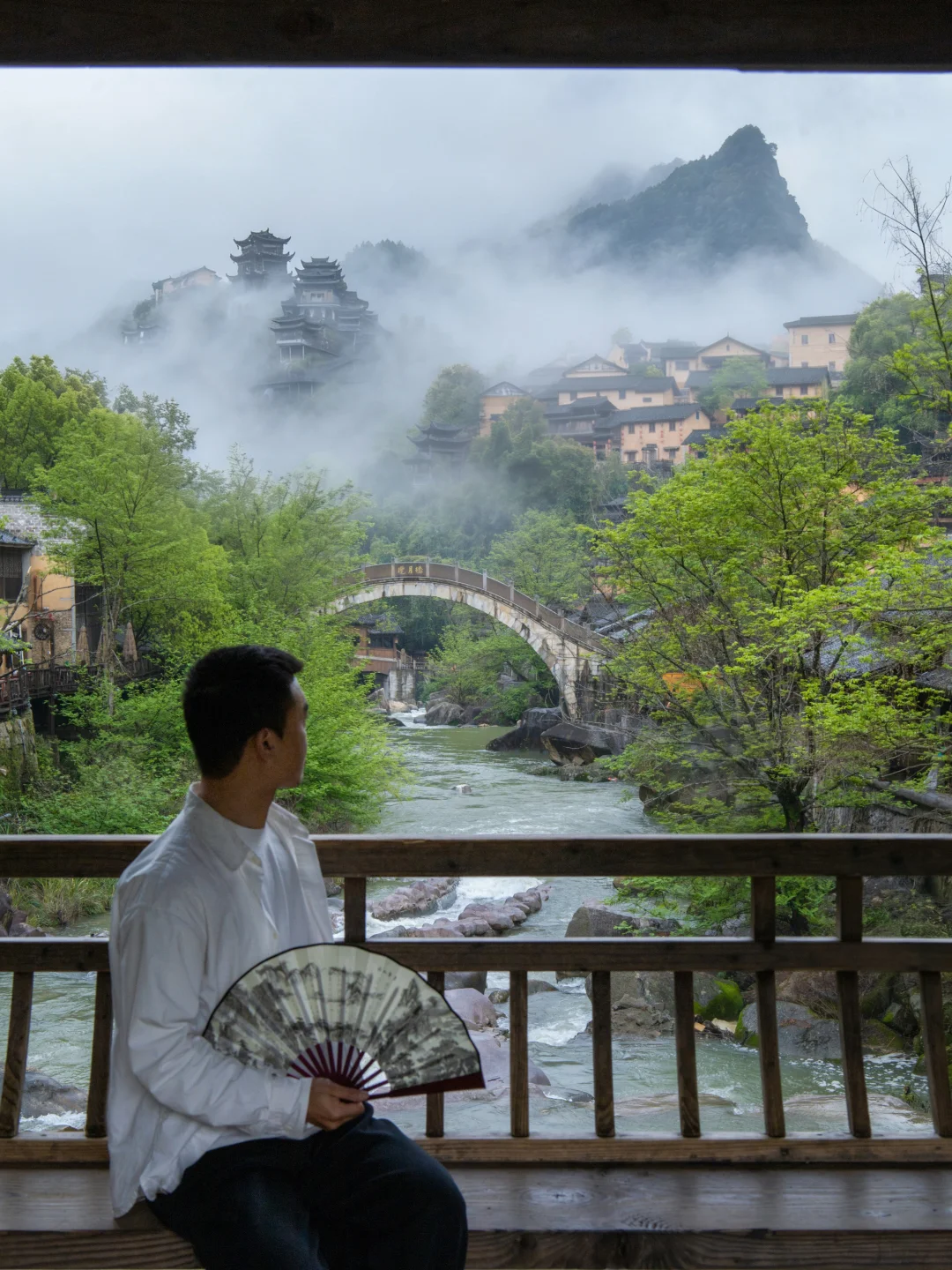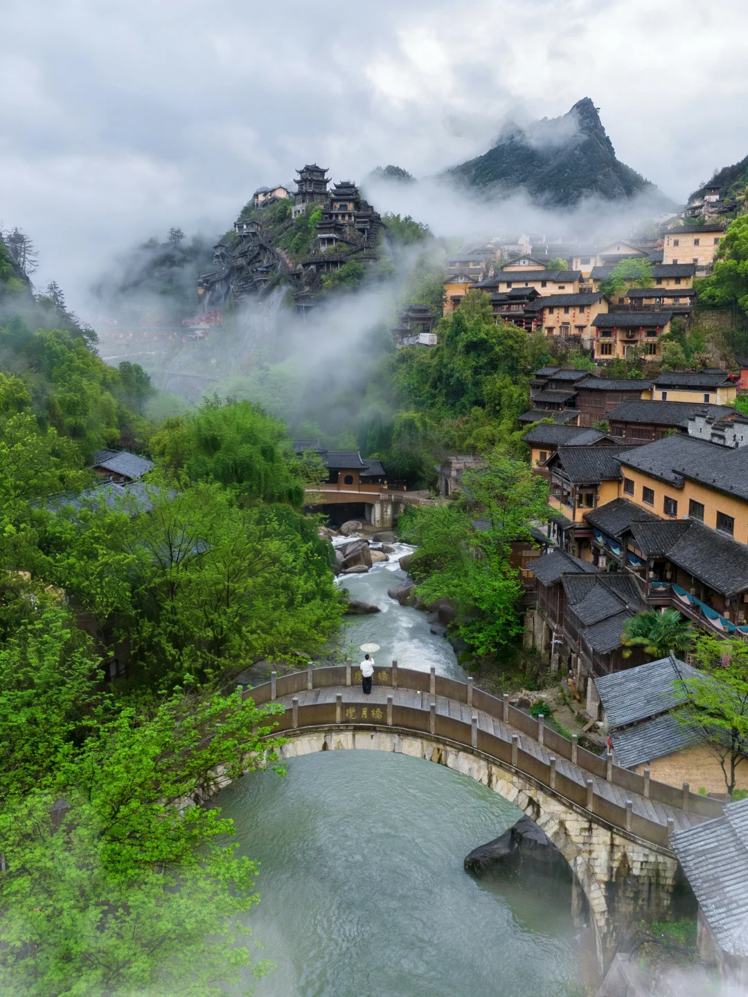 📍百舸桥(P9):白鹤崖+揽月桥+溪流+村落的同框机位,坐在桥上看晨雾也很有氛围感!