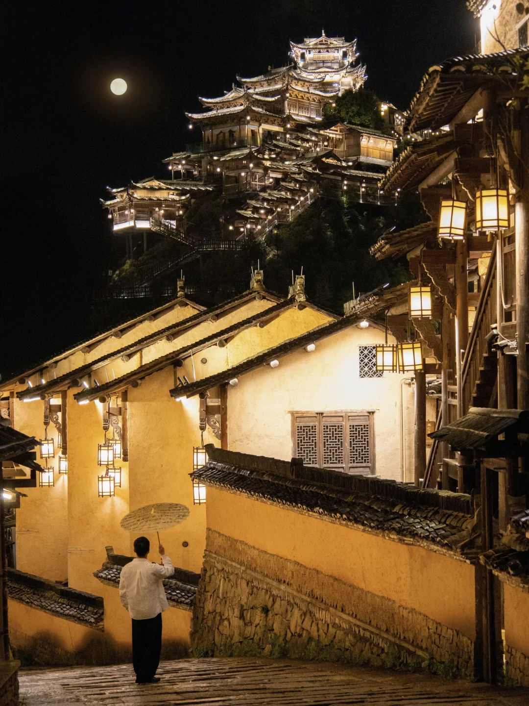 入夜灯火璀璨,圆月高悬天际