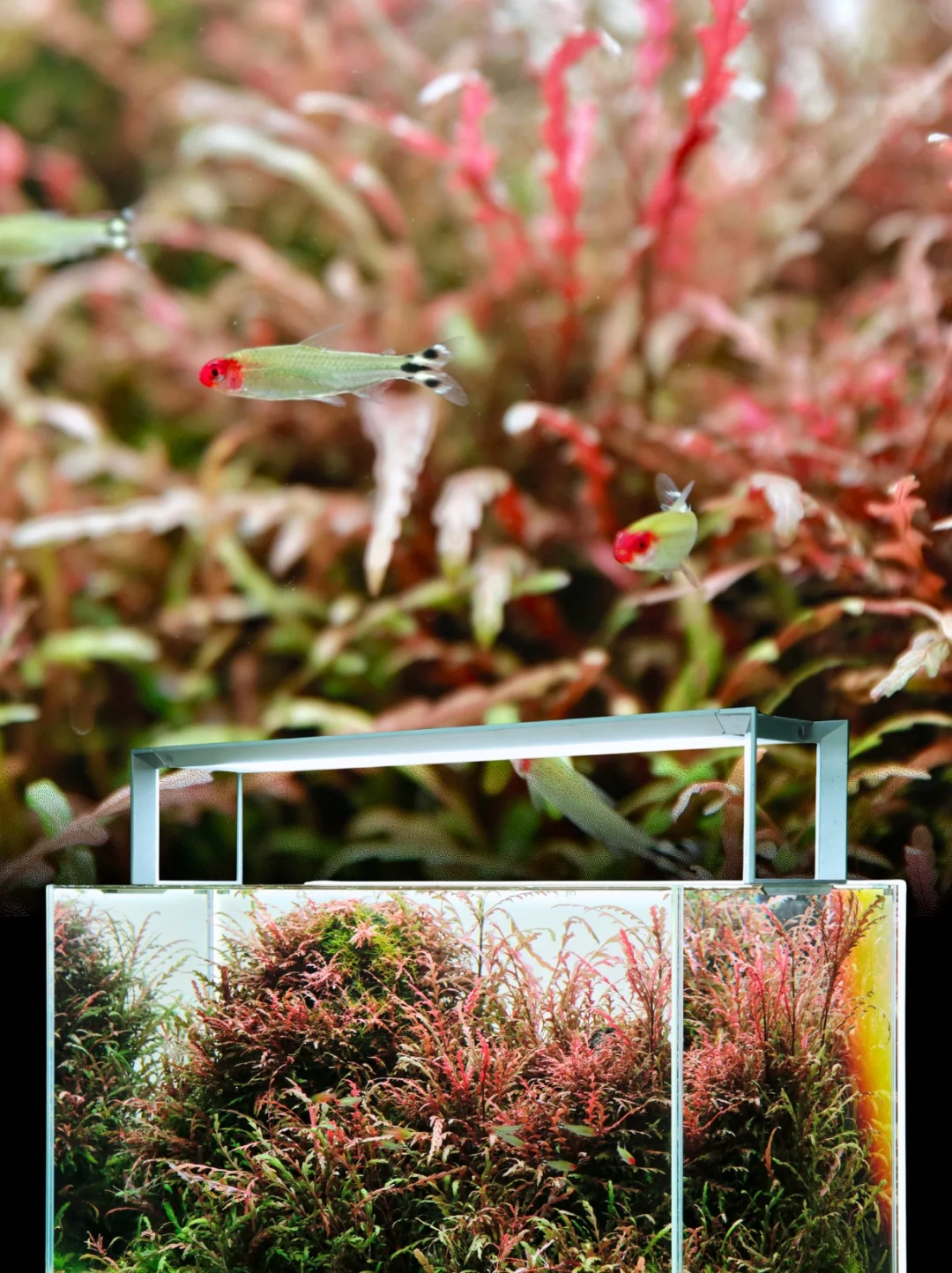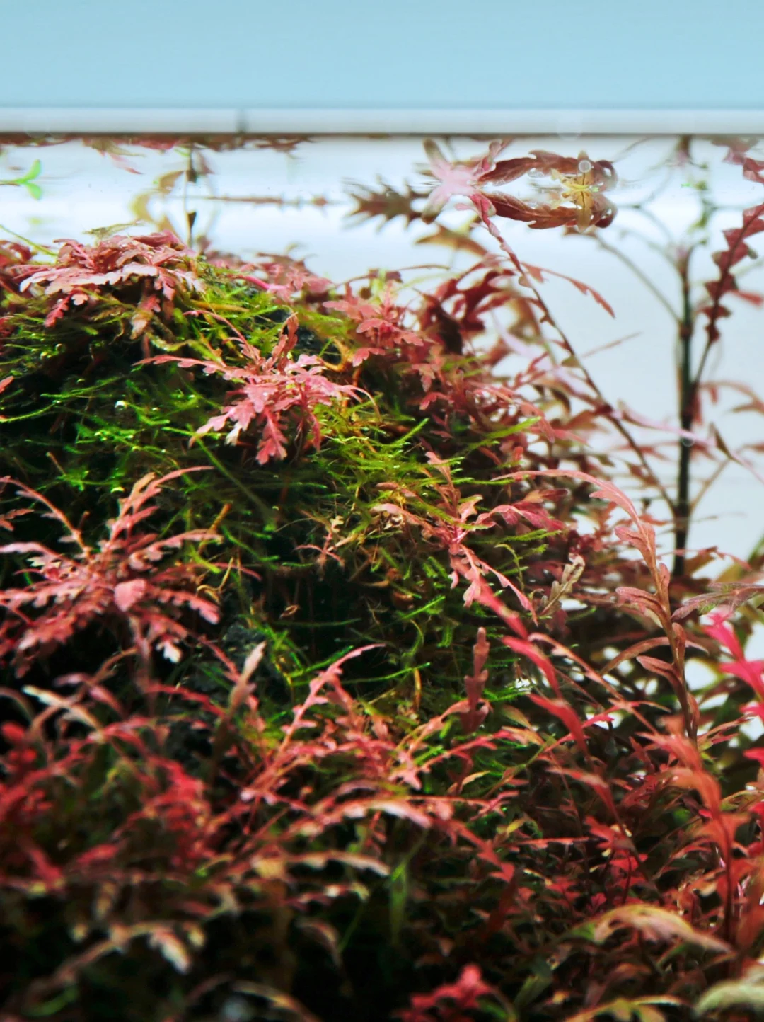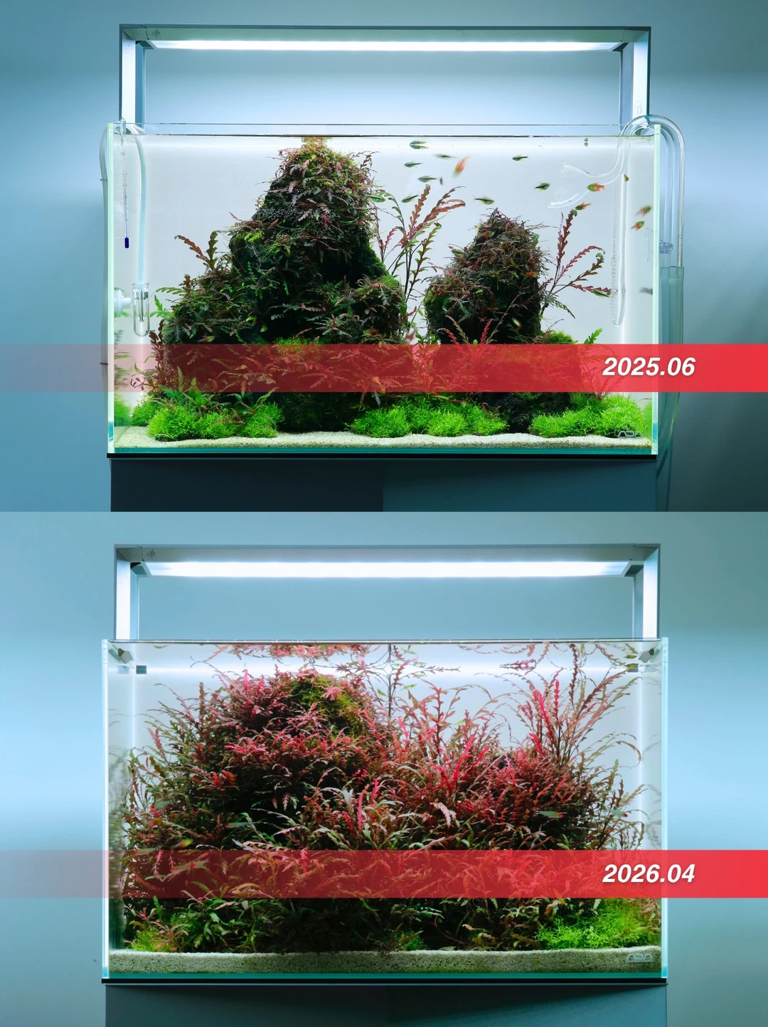 2025年6月,为了给多年前W1800缸中的UK羽裂水蓑衣留下一批后代,找了套W600缸,随便摆了两块云山石混着普通羽裂一起种了。岁月变迁,展厅都搬到原来位置的后身了,但因为光照太给力发色太好看,一直都没有舍得大剪,导致景观长期保持一种凌乱的状态...