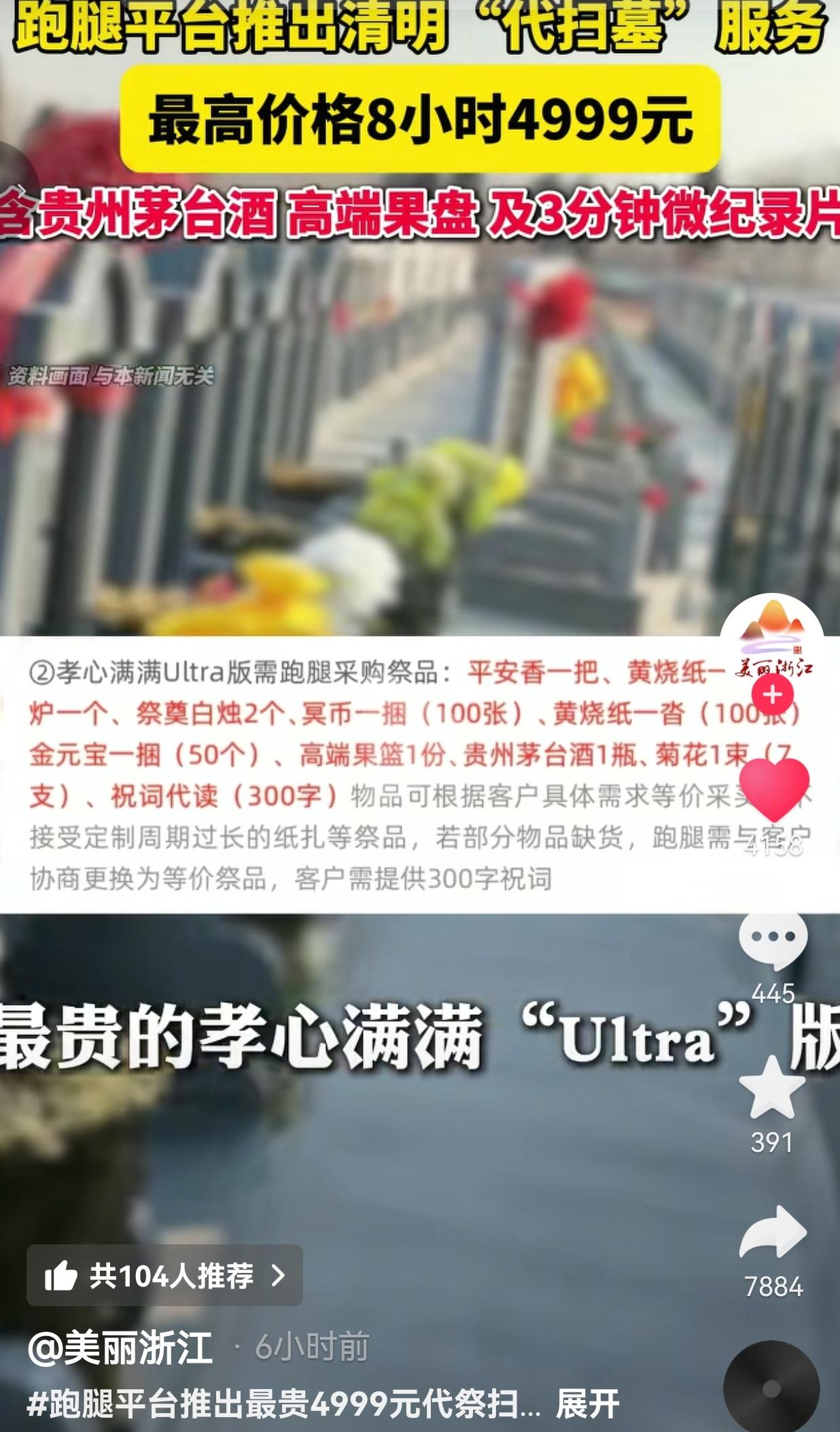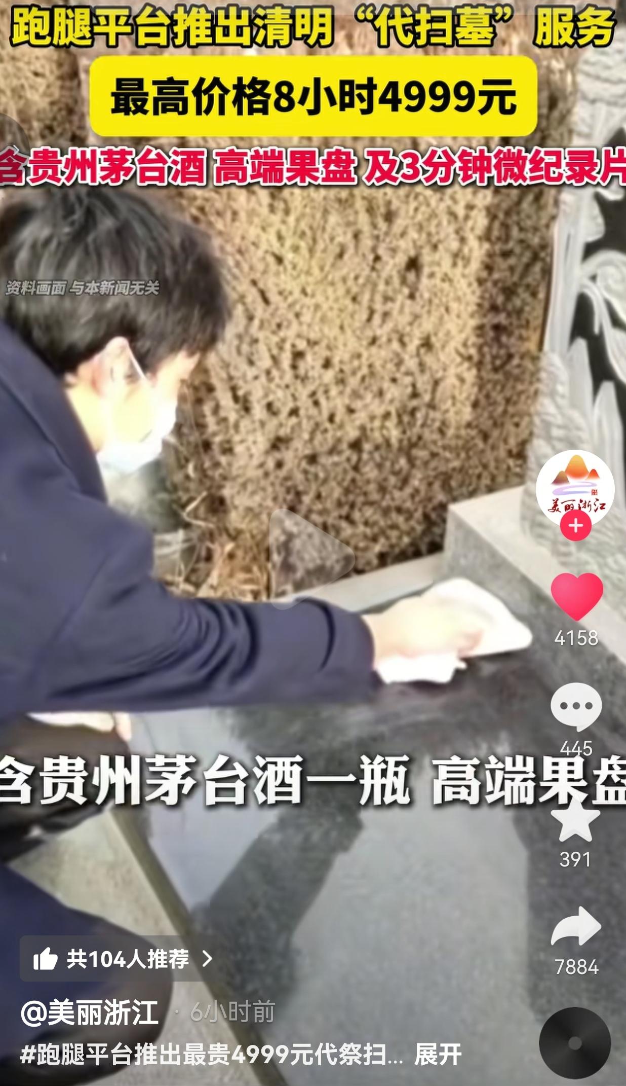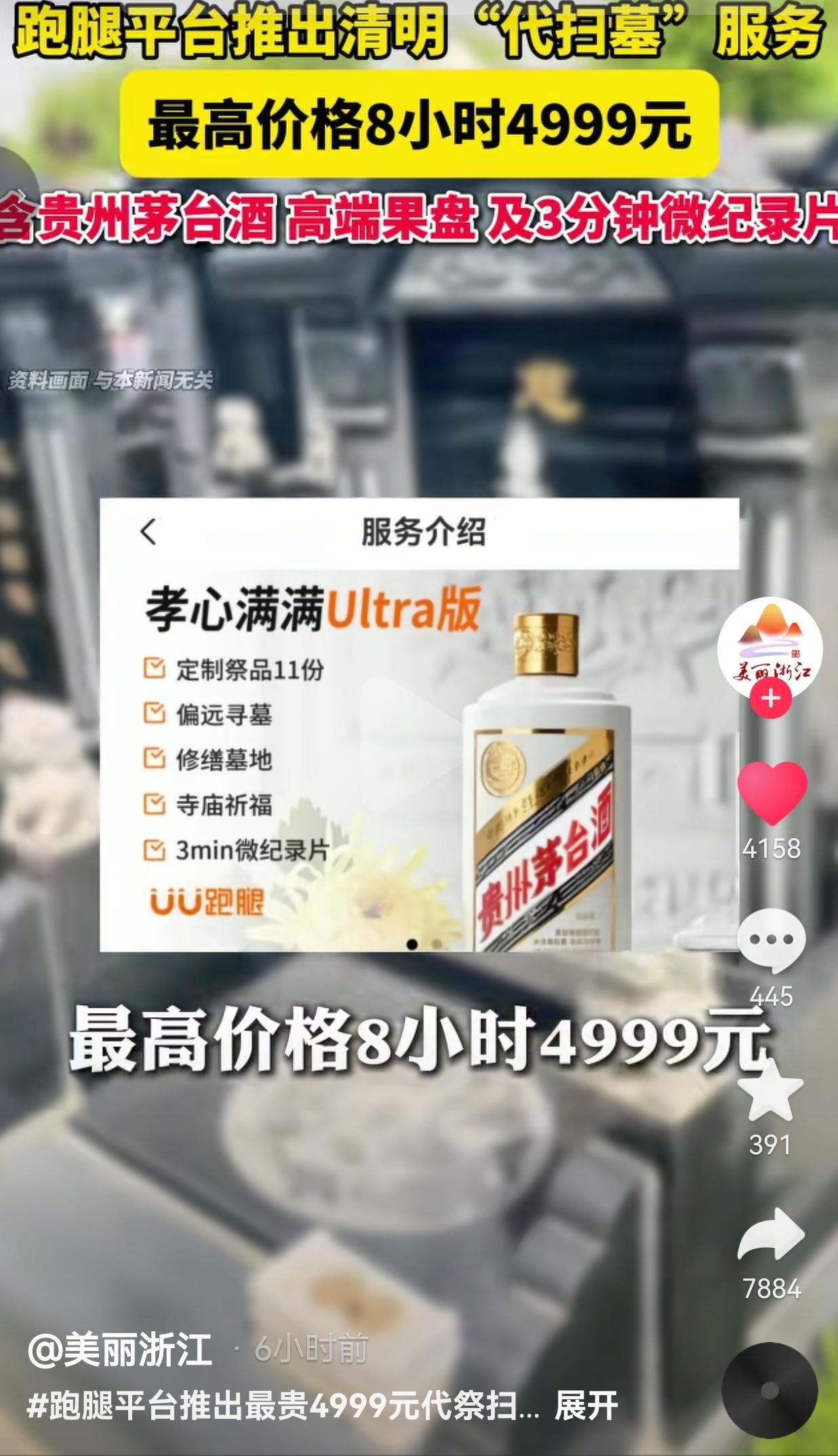 气死了!清明扫墓也能外包?分Pro/Max/Ultra三档,4999元含茅台,孝心也能明码标价? 近日,UU跑腿正式上线清明“代祭扫”服务,明码标价分三档,把“孝心”直接拆成商品卖。 Pro基础版:249元,清扫、敬香、献花、拍照反馈 Max升级版:449元,加全程直播、录视频、多份祭品 Ultra顶配版:4999元/8小时,含11份定制祭品、寻墓、修碑、祈福、3分钟微纪录片,甚至配一瓶2700元的飞天茅台 ! 平台数据显示,这类套餐已经售出40单,天价服务引发全网争议。 我看完真的五味杂陈。清明扫墓,本是中国人刻在骨子里的传统——拔草、擦碑、摆点爱吃的、说几句心里话,是思念,是缅怀,是根。 可现在倒好:人不到场,钱到位;磕头雇人,茅台摆上;拍个视频发朋友圈,就算“尽孝”。 你说忙、回不来,我完全理解。异地工作、出国、身体不便,没法到场很正常。 但花4999块,让陌生人给你父母爷爷奶奶磕头、敬酒、读悼词,这叫缅怀吗?这叫走流程、装样子、自欺欺人! 网友看到后评论说:“真笑了!雇人给祖宗磕头,脸不红吗?这不是尽孝,是糊弄鬼!” 也有的网友说: “4999还配茅台?怕不是给跑腿小哥喝的吧!孝心都能买卖,还有啥是真的?” 还有的网友说:“回不去就别扫!真有心再远都回,没心花多少钱都是演给别人看!” 我真的越想越不是滋味。平台为了赚钱,把最庄重的传统包装成“高端服务”,分三六九等卖钱,吃相太难看 。 更让人无奈的是,真有人买账——花大价钱买个“云尽孝”,拍视频晒孝心,实则连坟头方位都快忘了。 但咱也客观说:不是所有代扫都该骂。确实有人远隔千里、重病在身、工作特殊回不去,简单代扫、代献花,是无奈的寄托,能理解。 可4999元+茅台+纪录片,明显变了味:不是缅怀,是炫富、攀比、做给别人看的面子工程 。 真正的孝心,从来不是钱堆出来的。 是千里奔波亲手拔的草,是轻声说的“家里都好”,是心里那份惦记,是刻在骨子里的传承。 花钱外包的,只是形式;丢的是真心,寒的是先人,忘的是根本。 别拿“忙”当挡箭牌,别拿“花钱买心安”骗自己。 清明,从来不是做给别人看的,是做给自己、做给血脉的。 当缅怀可以明码标价,当孝心可以花钱外包,我们丢掉的不只是一个节日,更是中国人最珍贵的根与魂。 对此,你怎么看? 信息来源:美丽浙江