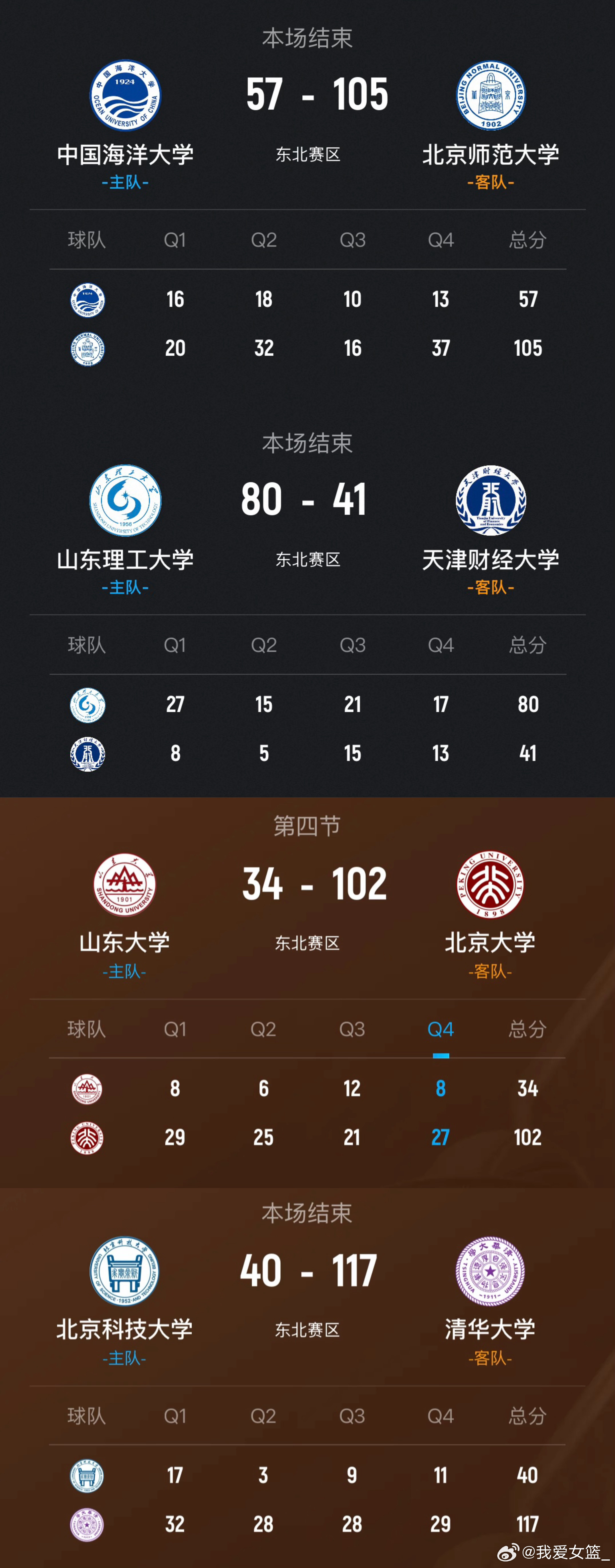 【CUBAL东北赛区女篮八强战罢 四强席位正式敲定】今日,CUBAL东北赛区1/4决赛激战落幕,北京师范大学、山东理工大学、北京大学、清华大学四支强队凭借出色发挥成功突围,斩获四强席位。 中国海洋大学57-105北京师范大学,毛婉如19分,李星诺16分8篮板5助攻,李青阳16分8篮板,张梓涵9分9篮板6助攻,冯灏14分。中国海洋大学李依坤19分5助攻,张荣荷14分5篮板。 山东理工大学81-41天津财经大学,王虹25分7篮板6助攻,马芮莹16分4篮板4助攻,邢欣13分7篮板,张乔雨10分12篮板6抢断。天津财经大学伍和岩14分9篮板。 山东大学34-102北京大学,董一诺21分,钱媛媛16分7助攻,赵婧涵12分8篮板,陈艳萍12分,李若莹10分。山东大学张丽梅11分5篮板。 北京科技大学40-117清华大学,刘琦19分,袁欣悦14分5助攻,李嘉琳14分7助攻,张涛12分7助攻,高梓悦12分6篮板。北京科技大学任新颖14分4篮板,朱梓绮9分。 接下来的四强对决必将看点拉满,青春无畏,逐梦赛场,精彩继续!cubal