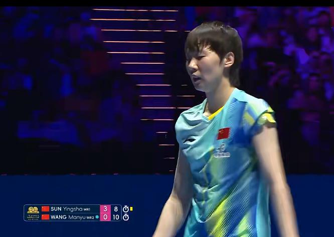 王曼昱深呼吸一口气, 孙颖莎黄牌之后, 赢了第三局, 第四局, 王曼昱4-8落后, 连追7分, 11-8扳回一局, 第五局,莎莎依旧主导比赛, 王曼昱打得很难受, 孙颖莎10-4冠军点, 王曼昱还在追分, 放手一搏, 没想到质量这么高, 孙颖莎11-7赢了, 比出3的手势, 创造了历史。