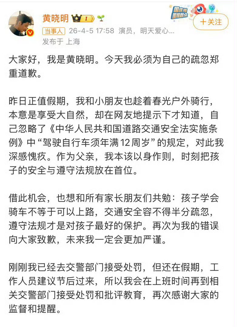 黄晓明已去交警部门接受处罚谢谢晓明哥,不然我也不知道还有这条规定