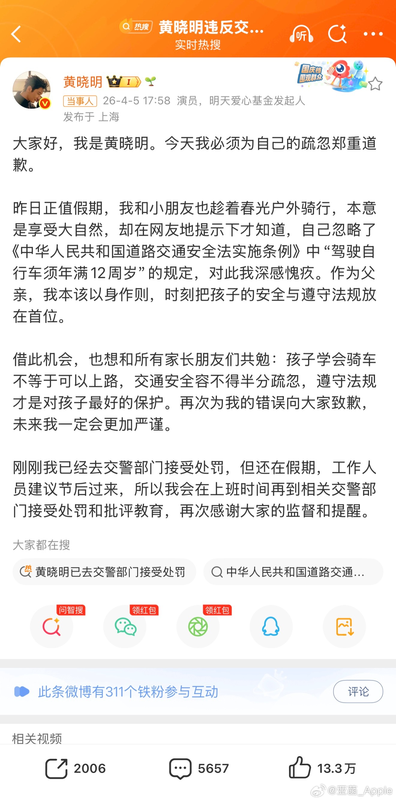黄晓明已去交警部门接受处罚黄晓明昨天晒了和儿子一起在市中心骑行的照片,网友在评论区质疑,小海绵未满12岁不应该骑车上路。黄晓明就带娃骑行道歉