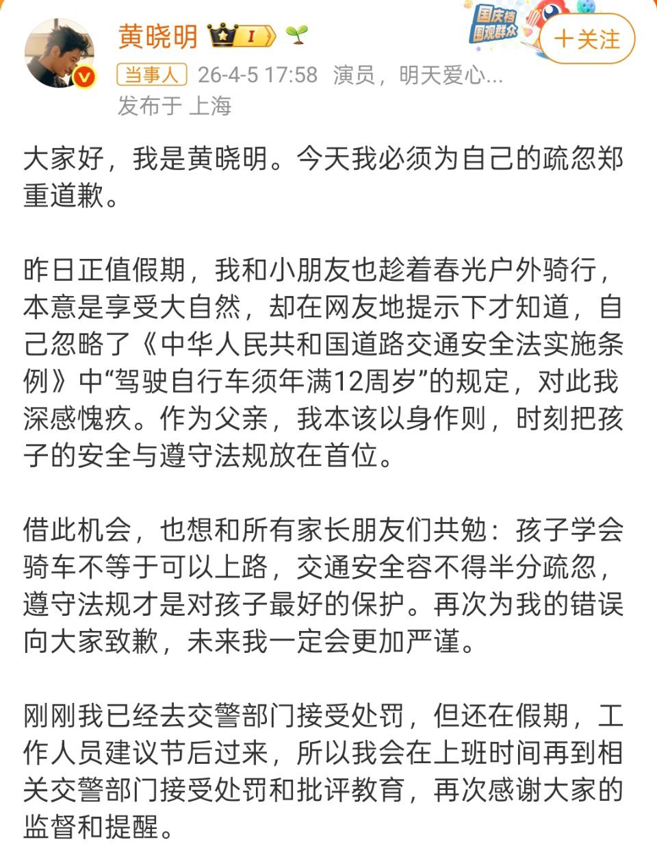黄晓明已去交警部门接受处罚晓明哥太有自觉性了!看出来baby和晓明哥对小海绵的教育是很不错的!虽然父母离婚,但是小海绵在爱中长大!