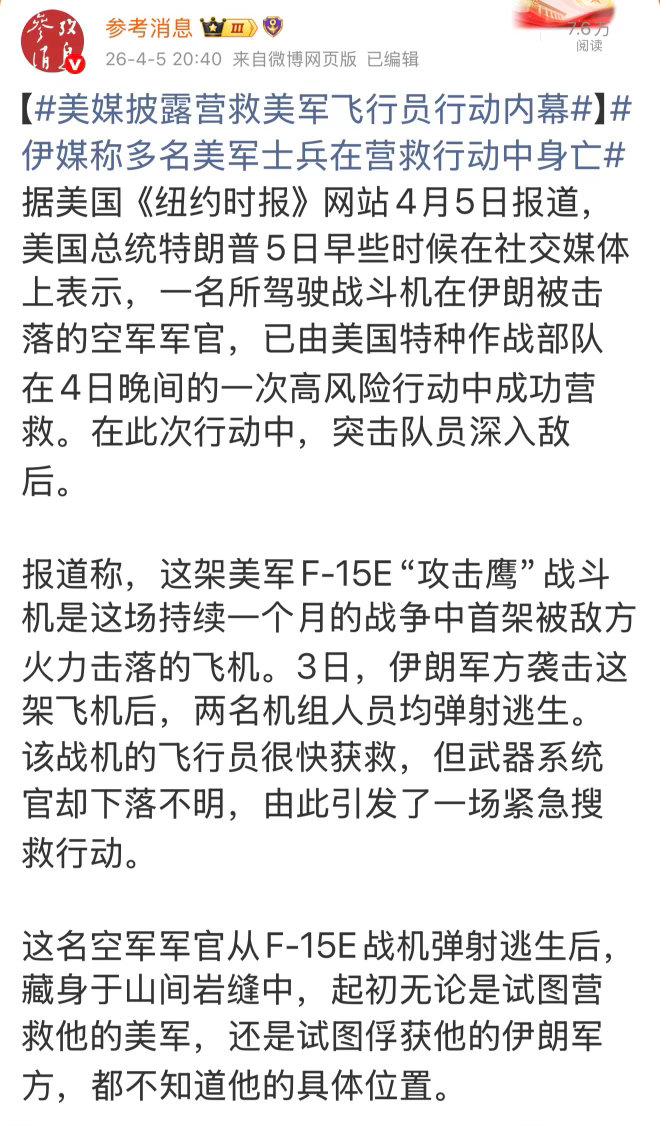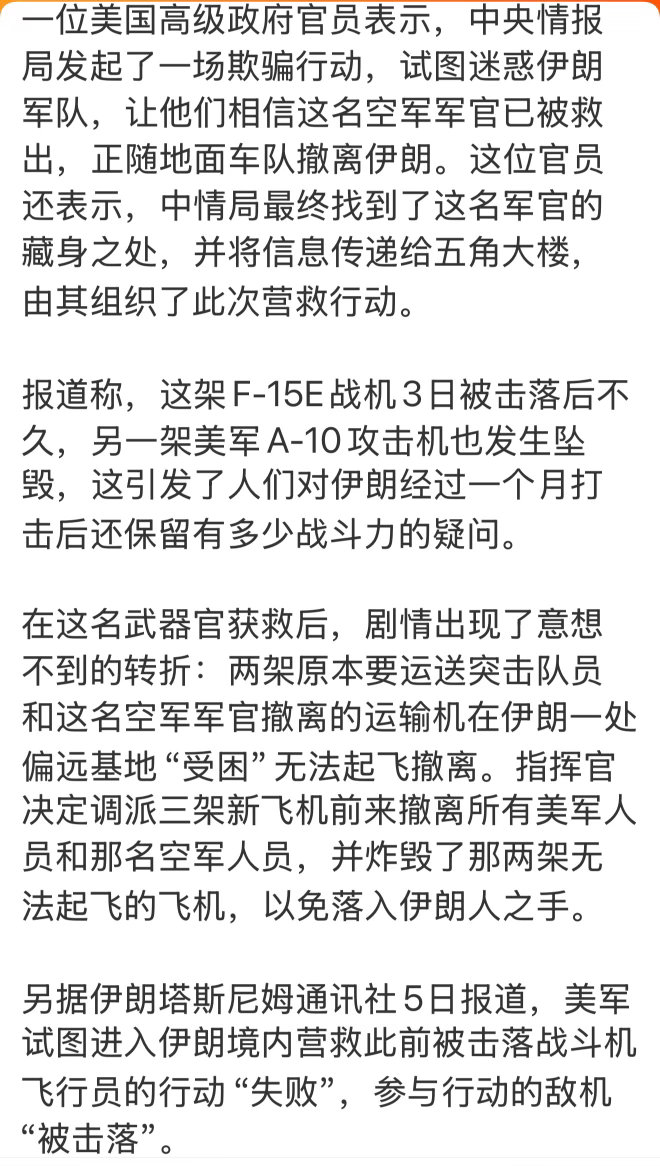 今天的一条关于营救一名美军飞行员行动内幕的报道堪比一部纪实文学。这也是自美伊开战以来最为详细和最精彩的战斗片段