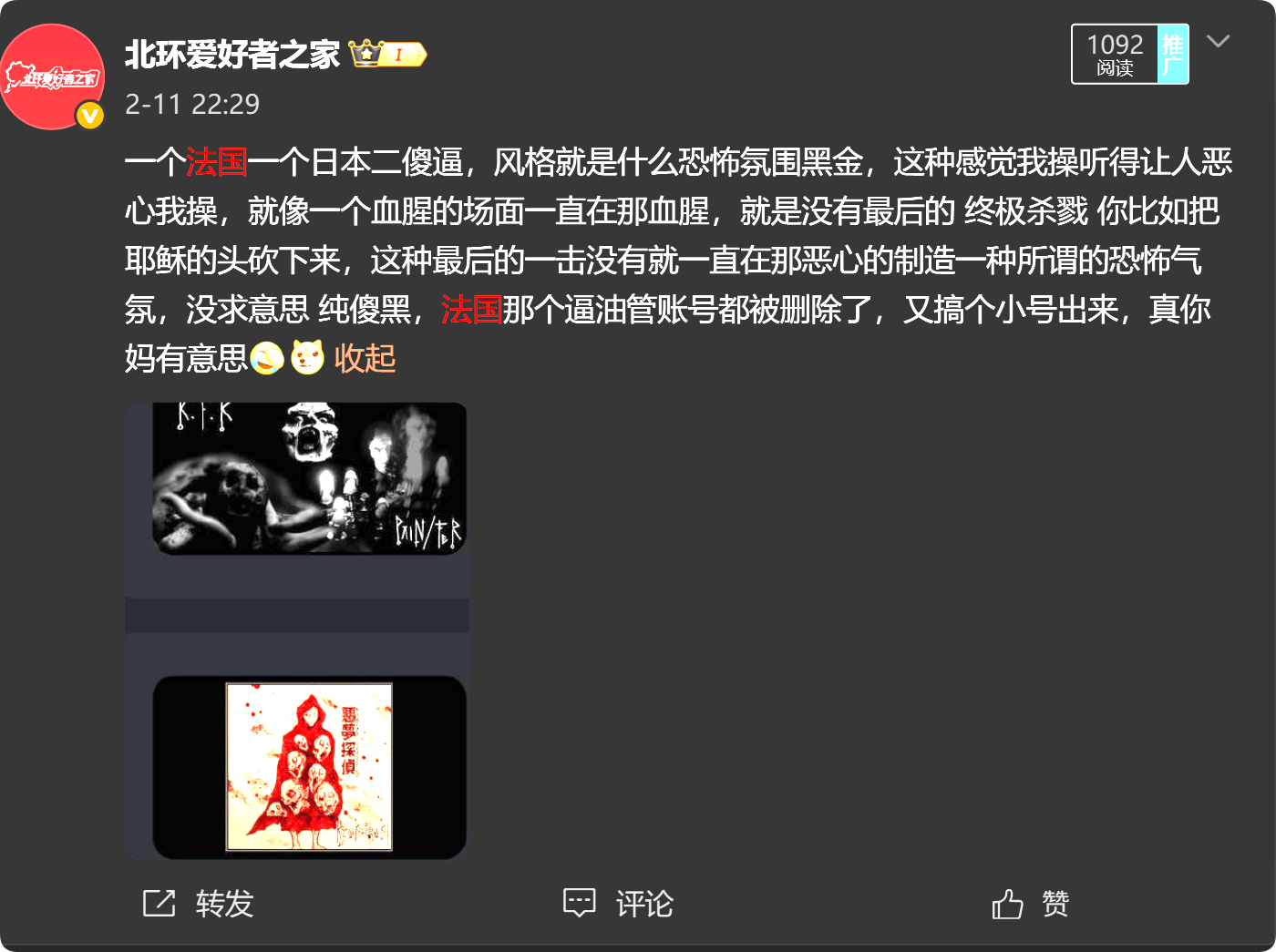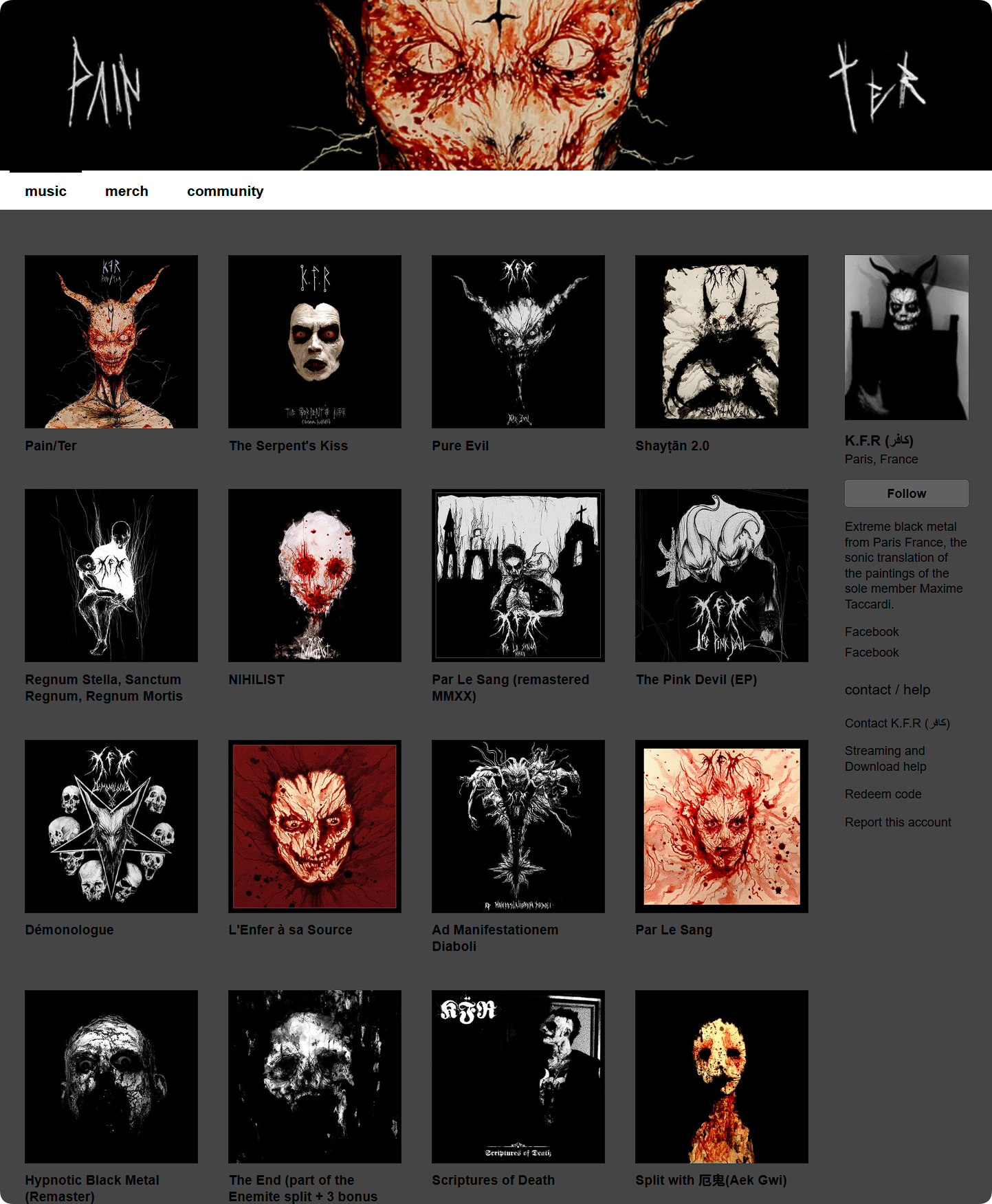 Maxime Taccardi这个中文网络的介绍太笼统了,哥闲了给你们详细介绍一下吧。他的音乐是以K.F.R展现的,至于音乐风格哥最后截图有过评价,他受过良好教育,梅斯的保罗·韦尔兰大学获得了艺术与文化社会学硕士学位。来自法国巴黎。曾做了几年美术老师和踢拳教练,直到决定退休,专注于艺术创作。是一名画家,同时也是音乐家、雕塑家、作家,摄影师和视频导演。喜欢在各种艺术领域尝试新事物。创作第四本书,于2022年由Heavy Music Artwork出版,三本书(《死亡之书》、《超越卡欧斯》和《恶魔之书》,他对作曲家理查德·瓦格纳(知名德国古典音乐艺术家)所探讨的“Gesamktkunstwerk”原则有着深厚的依恋(注意这里中文网络介绍的是他是Gesamktkunstwerk,没有说他的追求来源)。它基本上是多种艺术形式的融合。也受到作曲家亚历山大·斯克里亚宾)的影响,他试图在作品中传达联觉。探索一个致力于将所有感官融合为一件艺术品的概念。他的艺术是更深层思考的翻译,在某种程度上,它也关乎我们每个人内心潜藏的黑暗。任何人都能在其中找到自己内心的回声。父母在他还在读书时去世了,所以他毕业后别无选择,只能全力以赴。他们在与癌症长期抗争后去世。这对他的创作产生了深远且持久的影响。他画了一幅名为《癌症》的画,表现他们所经历的折磨和痛苦。除了越来越多的支持者和收藏家外,他还为乐队创作了大量艺术作品,主要是他的梦想和生活整体。创作是一种情感宣泄。把创伤和负面情绪转化为艺术。他一直处于“创作过程”的状态,让冲动引导他。有时不知道画布上会出现什么,但意志很强烈。他让自发性引导他。然后中文网络流传丫用自己血作画之说,也是事实,他认为人们应该更加害怕我们当前的现实。我们生活在一个黑暗的世界,而他的艺术正是这种状态的反映。可以画小花和快乐的主题,但那又有什么意义呢?对他来说,艺术是一种立场,是一种激发和激发人们反应的方式。鼓励思考和超越。它比言语更强大。信息可以被多种方式解读,这也是艺术魔法的一部分。有时他用自己的血液作为绘画媒介。这是赋予他的作品生命。字面意义上,是一种通过作品生活的方式。以直观且完整的方式体现Gesamktkunstwerk的精神。