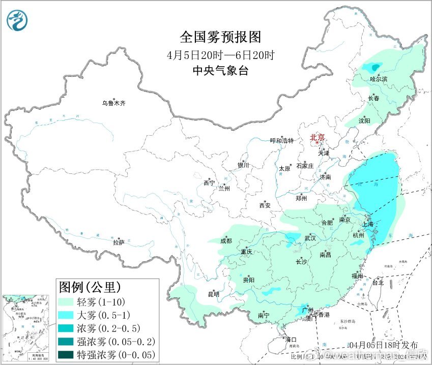 另外预计,5日20时至6日20时,黄海中部和南部海域、东海西北部海域、山东半岛东部沿海、青岛港、洋山港、长江口附近海域、杭州湾将有能见度不足1公里的大雾。此外,5日夜间至6日上午,黑龙江西南部、江苏中部、浙江东部、湖北南部、广西北部、广东西南部等地的部分地区有大雾天气,局地有能见度不足500米的浓雾。