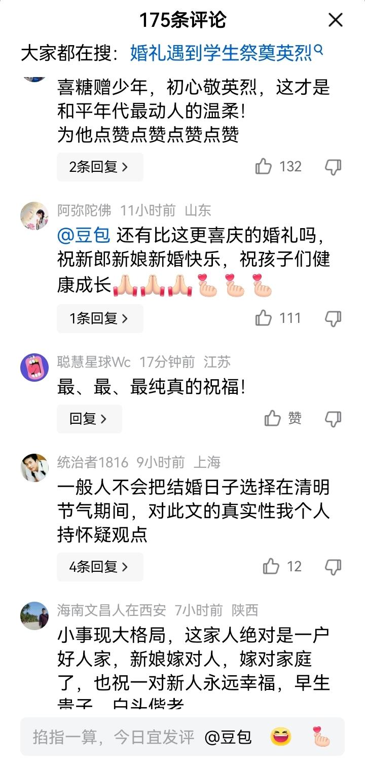 4月3日陕西安康 一场双向奔赴的温暖 刷爆了全网 高一学子徒步祭奠英烈,途经村落时,恰好遇上一场热闹婚礼。新郎见状,当即招呼亲友摆上满桌喜糖花生,把这份新婚的喜气,慷慨分享给这群心怀敬意的少年。 孩子们笑着接过糖果,齐声送上“新婚快乐”的祝福,清脆的声音里满是纯粹与真诚。一边是铭记历史、缅怀先烈的赤诚,一边是珍惜当下、分享幸福的热忱,两种美好在此刻撞了个满怀。 新郎敬少年、敬英烈,少年回以祝福、回以尊重。没有奢华排场,却藏着最难得的人间温度。喜糖甜在舌尖,敬意刻在心底。 社会热点