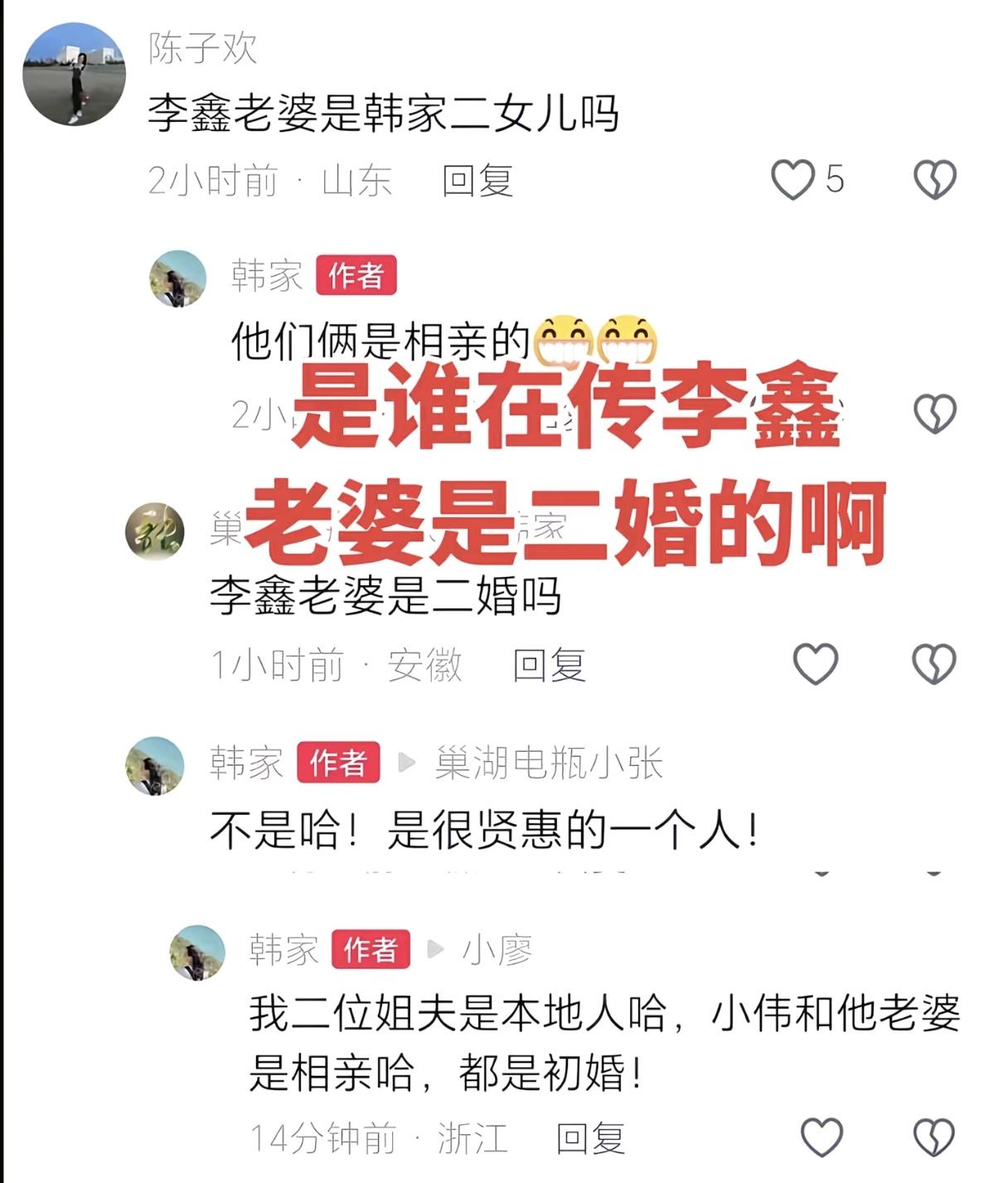 李鑫和老婆是相亲认识的,都是初婚! 还记得以前这个养家姐姐发过一个视频,当时是李鑫姐姐带着李鑫去买衣服的视频,养家姐姐转了这段视频,还说,当时李鑫相亲的时候,他们也是这么帮李鑫选衣服的。 现在她的视频都隐藏了!其实感觉韩家一直都在向李鑫姐姐靠拢的。 这个养家姐姐应该是老三,她说两个姐夫都是本地人,她现在在浙江,在老公老家。这也算是高情商回答李鑫老婆不是养家女儿的传言了吧! 感觉这个姐姐脾气还是挺好的,对于这种离谱的传言她没有破口大骂,而是委婉的回答了一下,情绪很稳定啊。