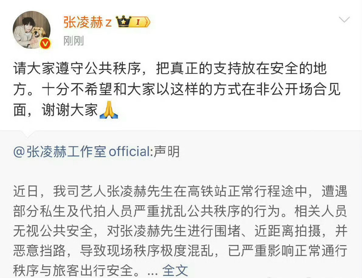 张凌赫说“十分不希望和大家以这样的方式再非公开场合见面。”张凌赫工作室郑重声明
