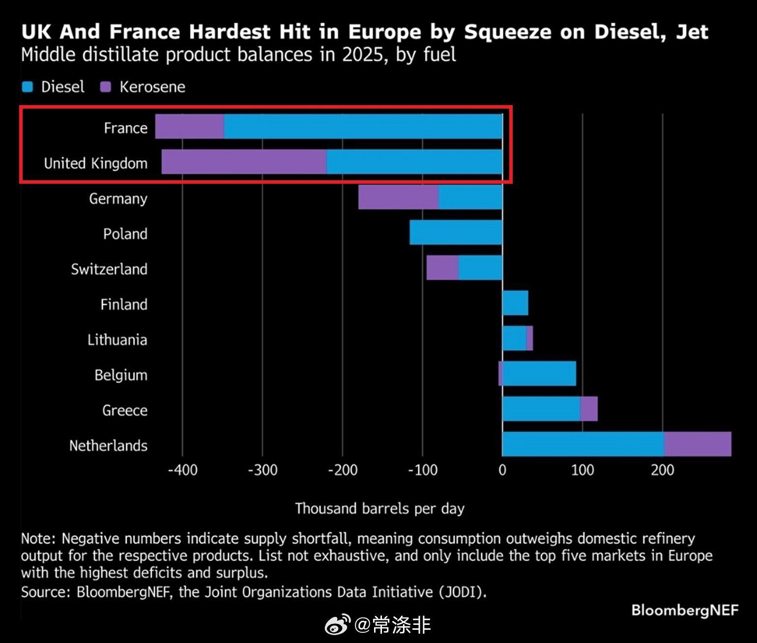根据彭博新能源财经的数据, 法国和英国是欧洲柴油和煤油缺口最大的国家, 两国的消费量均比国内炼油厂的产量每天少40多万桶。