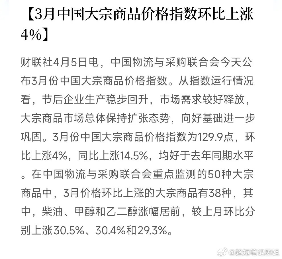 早上刷到一条消息,中国物流与采购联合会发布的数据:3月份中国大宗商品价格指数环比上涨4%,同比上涨14.5%。重点监测的50种大宗商品里,38种都在涨。