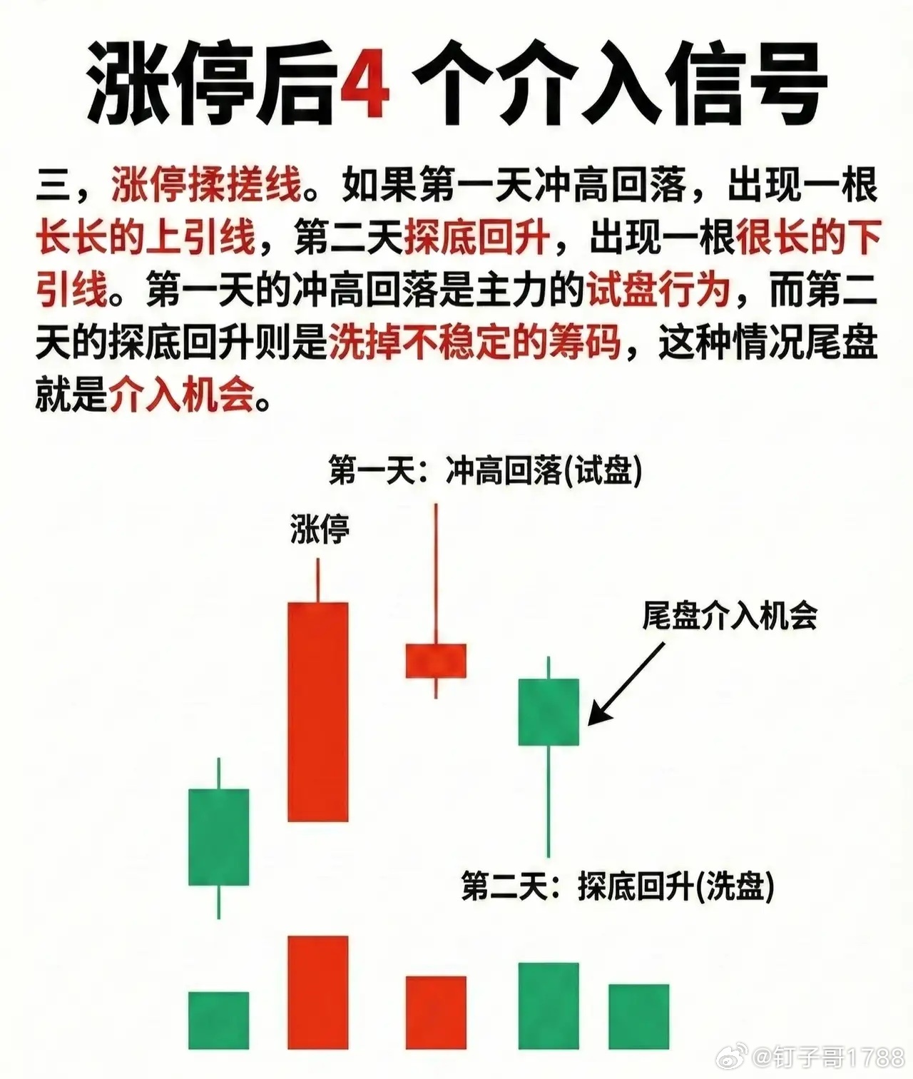 这四个信号均围绕“涨停后主力的洗盘、试盘、控盘行为”展开,通过K线形态(阴/阳、影线长短)、成交量变化(缩量/放量)的组合,捕捉主力“蓄力后拉升”的节点。实际操作中,需结合大盘环境、个股题材、板块效应等因素综合判断,提高胜率。