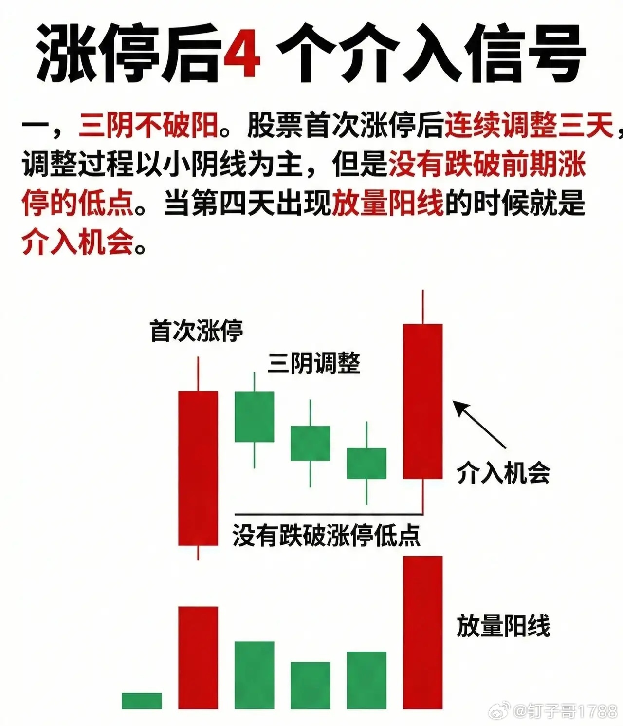 股票首次涨停后,进入连续三天的调整周期,调整过程中以小阴线为主,但收盘价始终未跌破前期涨停的最低价(即“不破阳”)。当第四天出现放量阳线(成交量显著放大,K线收阳)时,视为介入时机。