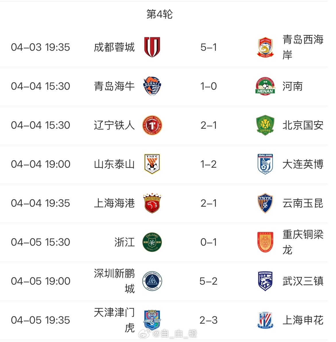 中超第4轮综述:间歇期归来的泰山队在主场迎来了大连英博的挑战,克雷桑有伤无法出场,刘洋国家队比赛回来轮休,泰山队攻击线被迫做出调整,德尔加多首发出场,但久疏战阵的泰山队全队表现低迷,始终组织不起有效的进攻,泽卡也错失了多次的破门良机,反而被英博抓住机会,上下半场各入一球。尽管韩鹏指导试图通过调兵遣将挽回败局,瓦科的进球终究还是来的太晚,我们无奈迎来了两连败。成都主场面对实力较弱的青岛西海岸,痛下杀手,5:1赢得毫无悬念,继续保持积分榜的领先;升班马重庆铜梁龙客场1:0险胜浙江,积分排名第二;国安的情况也一言难尽,客场1:2败给辽宁铁人,4轮仅取得1胜 1平2负积分—1,还未实现清零;降级区海牛1:0小胜河南,取得保级路上珍贵3分,但因“欠债”太多,还是排名倒数第二;天津津门虎的日子着实不好过,四场比赛1平3负还未取得过胜利,—9分也让天津与前面球队的差距越来越大,于根伟指导也遭遇了严重的信任危机,下课的呼声也是响彻主场。下轮比赛,泰山队客场挑战河南建业,韩指导能否带领球队走出低迷,6天后见分晓!山东泰山自由橙 附:【中超第4轮比分、积分榜、射手榜】
