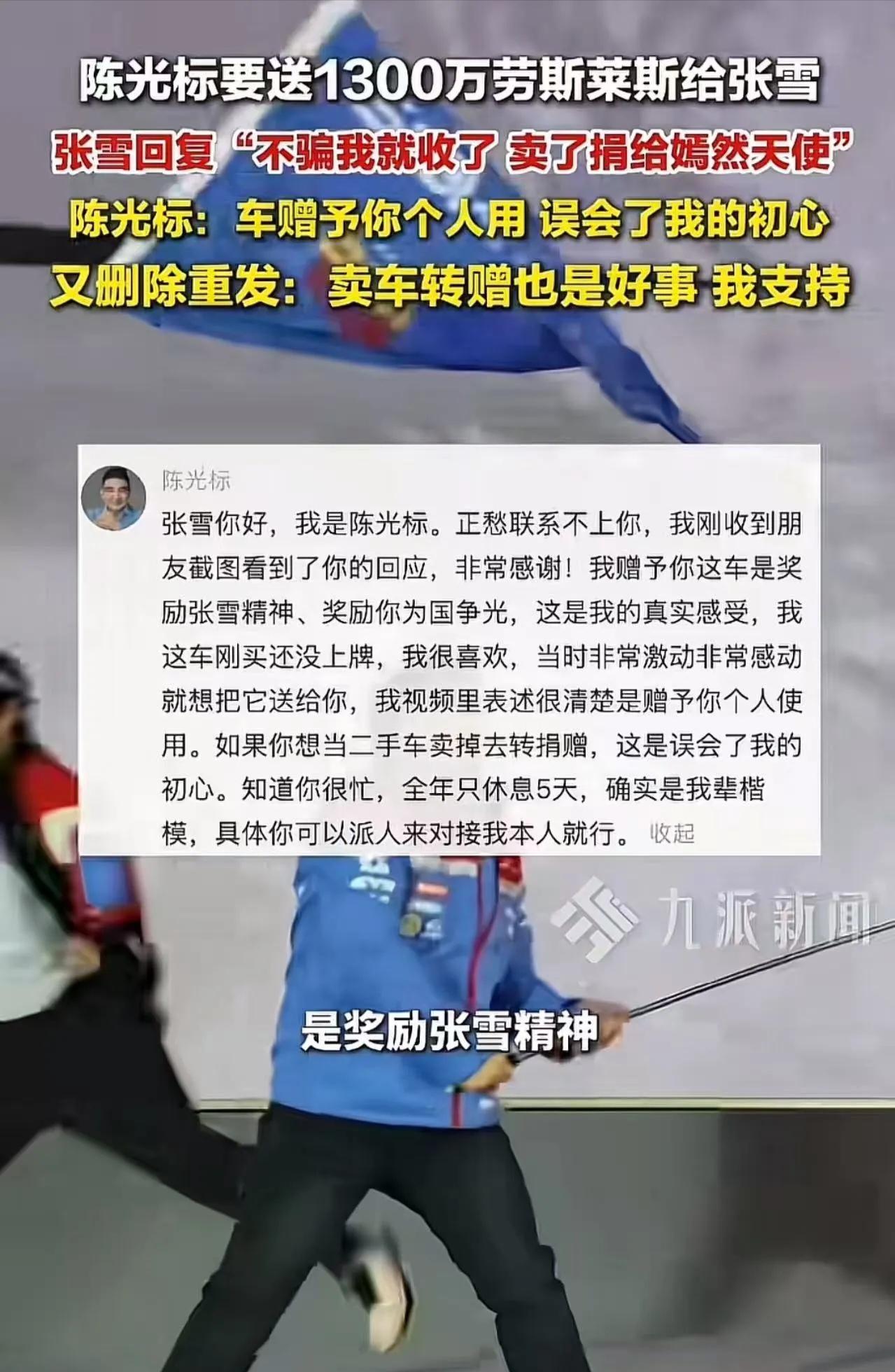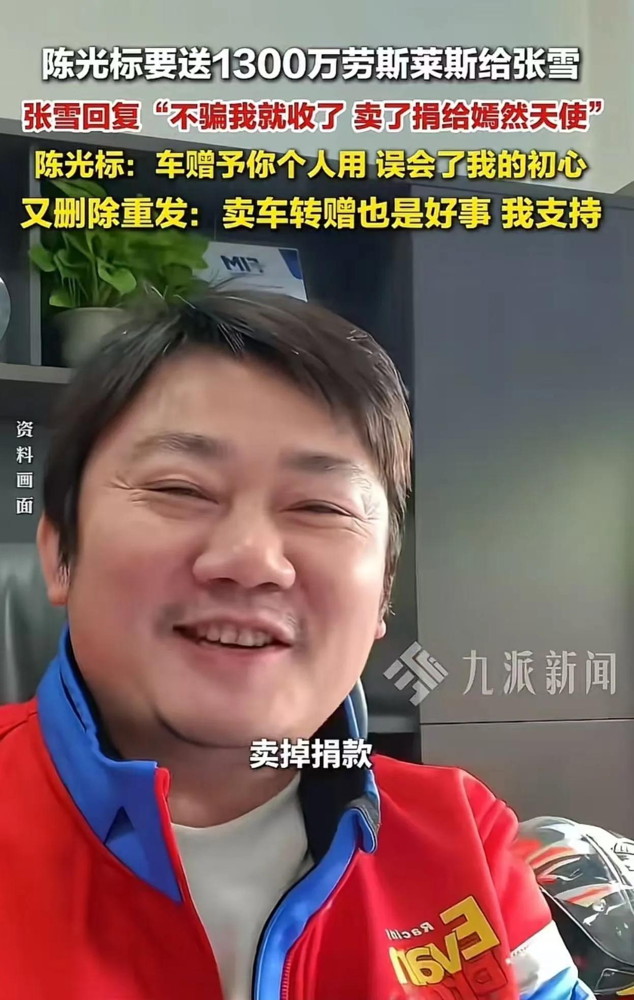 “陈光标又让人意外了!”劳斯莱斯变现1000万捐给嫣然医院,网友吵翻了 一场“送车”风波,最终以1000万捐款收场 4月5日,陈光标发视频宣布:将劳斯莱斯变现的1000万元,全额捐给嫣然天使儿童医院。转账凭证截图晒出,真金白银,一分不少。 事情起因是4月1日,陈光标高调宣布,为表彰张雪机车打破国外垄断、为国争光,赠送其一辆价值1300万的劳斯莱斯。不料张雪回应:收下后8折卖掉,把钱捐给嫣然医院。 陈光标最初表示“赠车是个人使用,卖车捐赠误会了我的初心”,引发网友质疑“舍不得捐”。他随即改口支持,但张雪迟迟未提车。于是陈光标自己把车变现,直接捐了1000万。 一、网友吵翻了:真捐还是作秀? 有人力挺:“实打实的1000万,有多少老板能做到?标哥好样的!” 也有人翻旧账:他年初承诺捐1300万给嫣然医院,一直没到账,这次是被舆论逼着捐。 还有人说:“论迹不论心,善款落地对患儿就是实实在在的帮助。” 二、法律分析:陈光标可以不送车吗? 根据《民法典》第658条,赠与财产权利转移之前,赠与人可以撤销赠与。劳斯莱斯还没过户,陈光标完全可以不送。这不违法。 但“公益、道德义务性质的赠与”不能随意撤销。陈光标这次送车的理由是“表彰为国争光”,不属于强制赠与范畴,所以他有权反悔。 最终他选择自己变现捐钱,反而更透明、更无法质疑。 三、舆论倒逼慈善,高调未必是坏事 陈光标从不缺争议。有人说他作秀,但他汶川地震、武汉疫情、甘肃地震,每一次大灾大难都冲在前面,捐的钱不计其数。 这次“送车变捐钱”,看似闹剧,实则是舆论倒逼慈善的典型案例。他被架在火上烤,最终选择最直接的方式——自己掏1000万。 高调慈善有一个好处:经得起监督。因为所有人都在盯着,他不敢作假。 结语:论迹不论心,真金白银就是硬道理 你可以质疑他的方式,但无法否认他的行动。1000万到账,患儿受益,这就够了。 你怎么看?陈光标这次是真心慈善还是顺势作秀?欢迎评论区聊聊。 来源:综合证券时报、澎湃新闻等报道。法律依据《民法典》第658条。