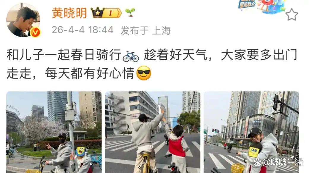 4月4日,黄晓明突然高调发文,字里行间都是骄傲和兴奋,谁能想到,这次他居然带着儿子小海绵外出骑行了,这么亲昵的亲子时光,难怪他迫不及待和大家分享了。 这波晒娃到底藏着多少细节,看完才懂他的用心。很多人都知道,黄晓明平时对孩子的隐私保护得特别好,很少这么高调地分享亲子日常,这次突然发文,其实藏着他不想被忽略的小心思,只是没人一开始就读懂。 照片里父子同穿休闲装,在上海街头骑行,画面朴素又真实,没有精修滤镜,也没有刻意摆拍,完全就是普通父子出门散心的样子。 黄晓明骑的是随处可见的共享单车,没有开豪车随行,也没有保镖在旁边跟着,褪去了明星的光环,看上去就和身边普通的爸爸没什么区别。 可能有人会疑惑,以他的条件,完全可以安排更奢华的亲子活动,可他偏要选最接地气的骑行,其实这背后的细节,远比表面看起来更戳人。 小海绵今年9岁,身高快到黄晓明肩膀,粗略算下来差不多有1.5米左右,身形挺拔,看得出来平时被照顾得很好,也成长得格外迅速。 他骑的儿童车售价仅1299元,就是市面上很常见的款式,没有明星家庭常见的奢华感,不像有些星二代,从小就用着天价玩具、骑着高端儿童车,小海绵的这辆车,甚至和很多普通家庭的孩子用的没什么差别。 没人注意到,黄晓明自己穿的卫衣也是平价款式,和小海绵的穿搭风格相近,不刻意打造亲子装,却处处透着默契,这种不刻意的温柔,其实比刻意的秀恩爱更动人。 这次骑行刚好赶上清明假期,黄晓明特意抽出时间,陪小海绵穿梭在上海的街头,沿途有盛开的樱花,风吹过的时候,花瓣轻轻飘落,氛围感拉满,但他没有刻意拍风景,镜头里大多是他和小海绵的互动瞬间。 两人会在路口等红灯的时候默契比耶,会在斑马线上高高击掌,偶尔黄晓明还会从身后轻轻环抱住小海绵,眼神里的宠溺藏都藏不住。 可能有人不知道,黄晓明和小海绵平时就是这样“哥们式”的相处模式,他不会以父亲的身份居高临下,反而会认真倾听孩子的想法,就连做一些决定,也会主动征求小海绵的意见。 其实熟悉黄晓明的人都知道,他离婚之后,就一直格外注重对小海绵的陪伴,哪怕工作再忙碌,也会抽出时间陪孩子写作业、做运动,每周都会尽量留出专属的亲子时光。 之前有网友偶遇两人一起逛公园、吃小吃,全程都是黄晓明耐心陪着小海绵,跟着孩子的节奏走,没有一点明星架子。 这次晒出的骑行照片,他还特意给小海绵的正脸做了遮挡处理,既分享了亲子日常,又最大程度保护了孩子的隐私,这份细心,其实早就藏在他的每一个举动里。 让人意外的是,这组照片晒出之后,除了满屏的温情,还引发了一些小小的争议,有人注意到,小海绵今年9岁,而根据相关规定,驾驶自行车上路必须年满12周岁,不少人担心这样的行为存在安全隐患,也有人猜测,他们骑行的路段可能是封闭绿道,并非公共道路。 不过很少有人提及,黄晓明平时就很注重孩子的安全,这次骑行,他全程陪在小海绵身边,时刻留意着周围的环境,只是这些细节,很容易被大家忽略。 还有人发现,黄晓明这段时间其实一直在调整自己的生活节奏,甚至暂停了部分演艺工作,一方面是为了备考,另一方面也是为了有更多时间陪伴家人。 之前他在综艺里高空蹦极前,还特意打电话给小海绵求安慰,听到孩子说“别蹦,危险”,他当场就放弃了挑战,这份被孩子左右的柔软,是他从未在公众面前过多展现的一面。这次高调晒出骑行日常,或许也是想告诉大家,比起明星的身份,他更在意的,是作为父亲的责任。 这波晒娃,没有奢华的排场,没有刻意的炒作,每一个细节都透着黄晓明对小海绵的用心,从平价的儿童车,到接地气的共享单车,从默契的互动,到对孩子隐私的保护,每一处都藏着他的父爱。 有人说,明星的亲子日常大多是演给外人看的,但黄晓明的这份真实,却很难让人质疑。毕竟,刻意装出来的温情,藏不住这么多细碎的细节,也不会有这样自然的互动。 其实仔细看就会发现,黄晓明对小海绵的爱,从来都不是轰轰烈烈的,而是藏在每一个平凡的日常里,是骑行时的陪伴,是倾听时的耐心,是保护时的细心。 不知道大家看完这些细节,有没有读懂他的用心?对于黄晓明带小海绵骑行这件事,你怎么看?是觉得他足够用心、接地气,还是觉得存在安全隐患?欢迎在评论区说出你的观点。