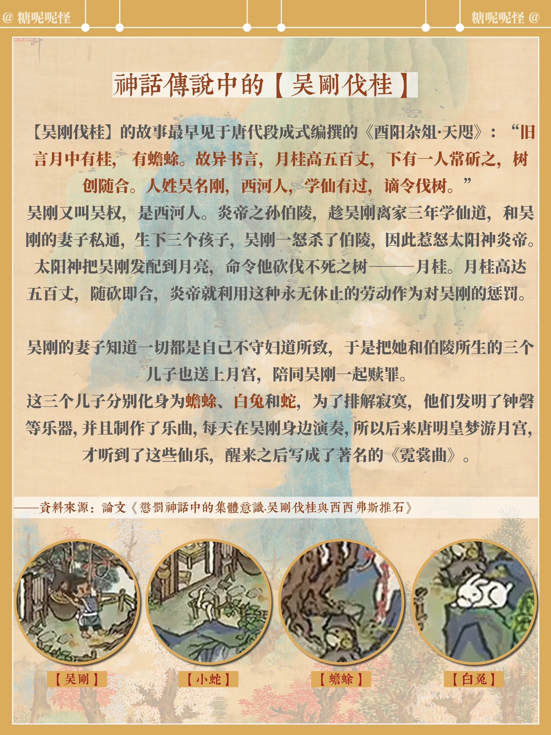 【吴刚伐桂】的故事最早见于唐代段成式编撰的《酉阳杂俎·天咫》:“旧言月中有桂, 有蟾蜍。故异书言,月桂高五百丈,下有一人常斫之,树创随合。人姓吴名刚,西河人,学仙有过,谪令伐树。”
