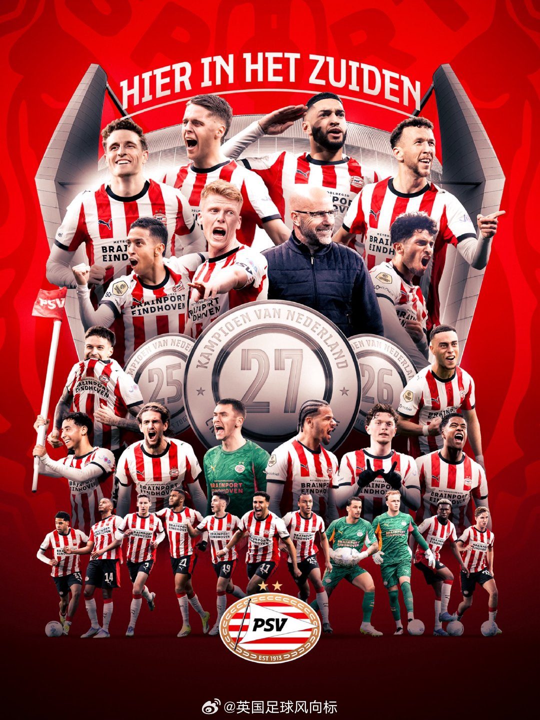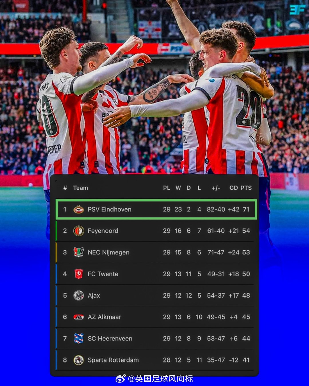 荷甲第29轮,埃因霍温主场4比3击败乌德勒支,费耶诺德作客0比0被沃伦丹逼平。埃因霍温榜首优势扩大到17分,在联赛只剩下5轮情况,提前夺得2025-26赛季荷甲联赛冠军,实现荷甲三连霸,这是埃因霍温俱乐部史上第27个荷甲冠军。