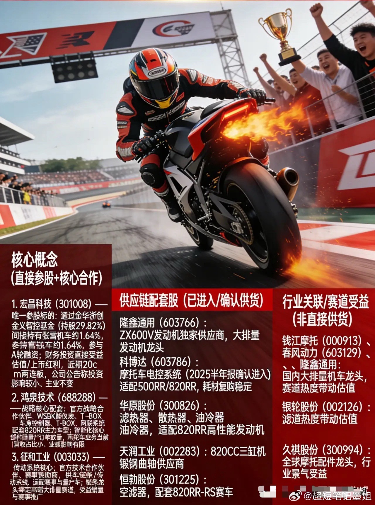 这一梯队主要受益于张雪机车产能扩张带来的零部件采购需求。4. 隆鑫通用 (603766)● 角色:大排量发动机龙头● 关联:为ZX600V车型独家供应发动机。5. 科博达 (603786)● 角色:汽车电子龙头● 关联:为500RR/820RR等车型提供电控系统。6. 华原股份 (300826)● 角色:滤清器供应商● 关联:2025半年报已确认进入供应链,具备耗材复购属性。7. 银轮股份 (002126)● 角色:热管理专家● 关联:为820RR高性能发动机提供散热器与油冷器。8. 天润工业 (002283)● 角色:核心部件供应商● 关联:为820CC三缸机提供锻钢曲轴。9. 恒勃股份 (301225)● 角色:进气系统供应商● 关联:为820RR-RS赛车定制高性能空滤器。三、行业关联:赛道情绪受益