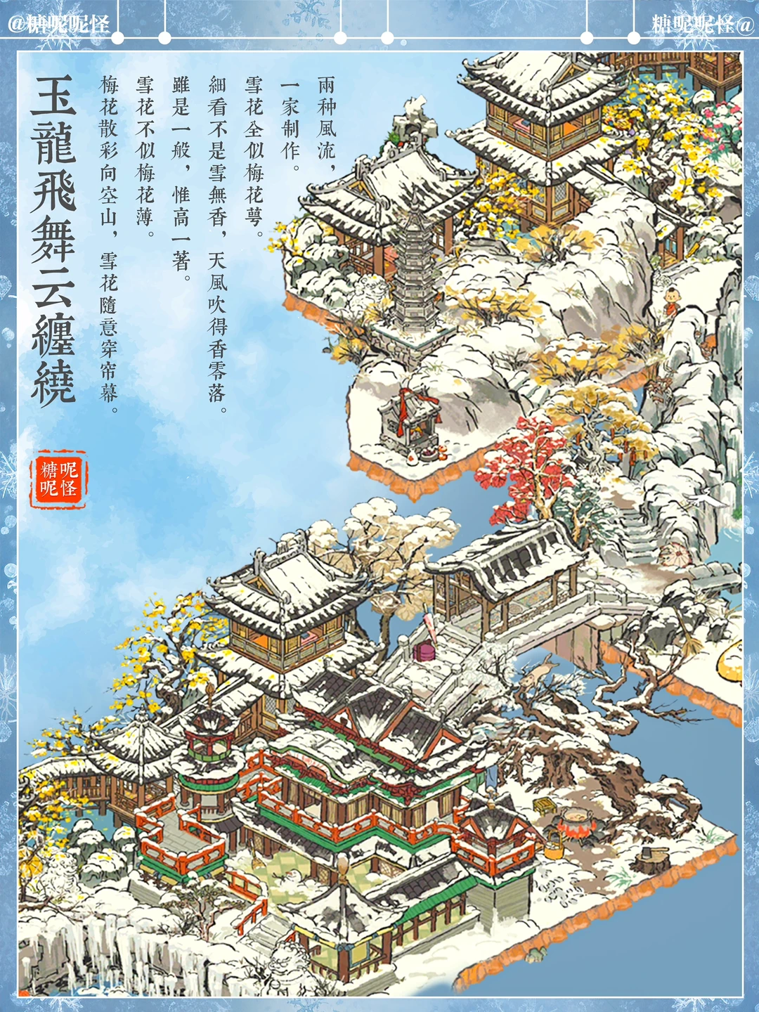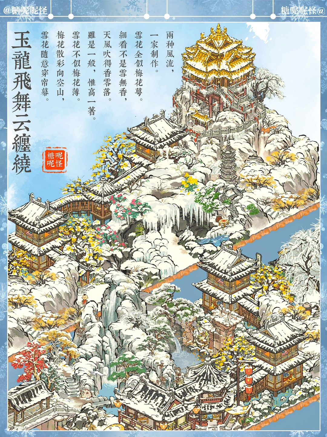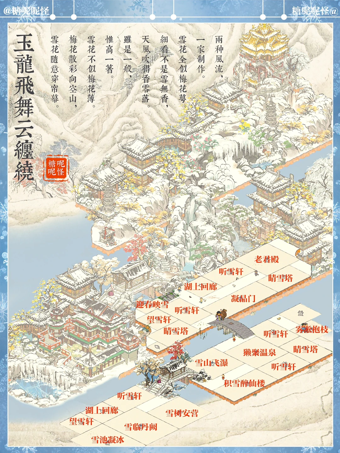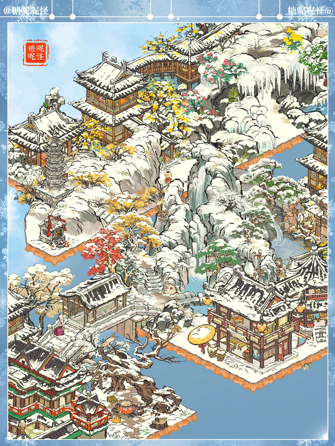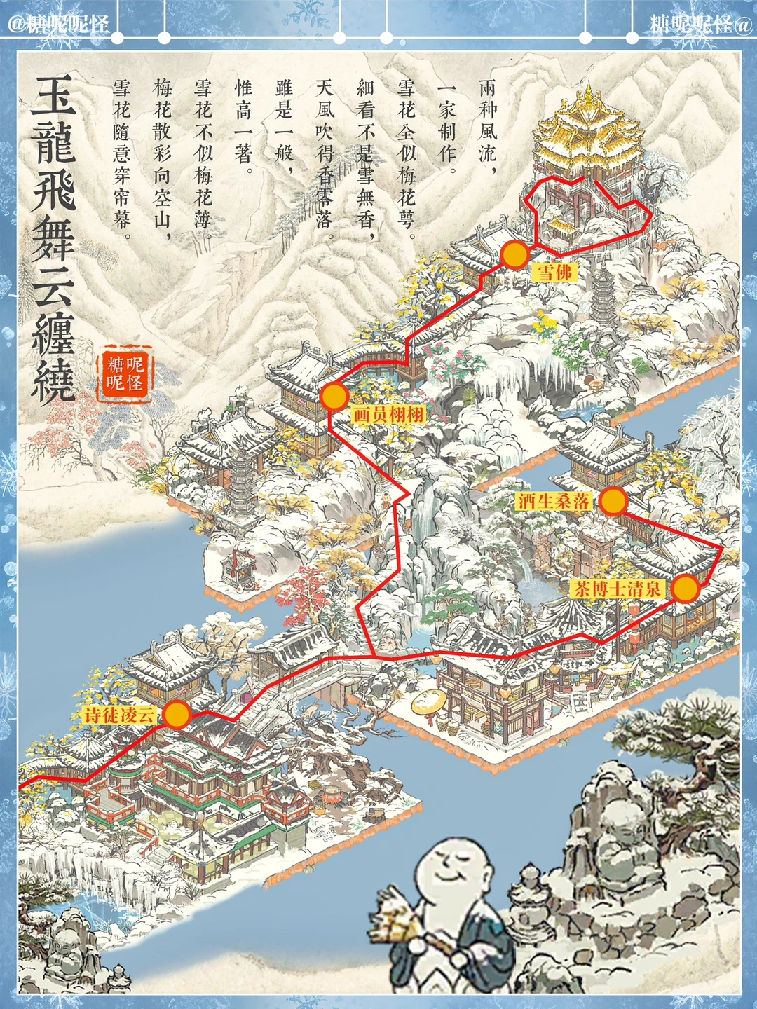 如果是你,你会怎样去到老君殿…… 糖大人先是宿在山脚凌云家,第二天穿过廊桥,先去探访了茶博士清泉和酒生桑落,他俩都住在雪山脚下…… 第三日迎着飞瀑翻越雪山,途经画员栩栩处,与之观雪赏画一日…… 依依不舍拜别栩栩,继续赶路,奈何雪山雪景实在优美,路上耽搁两日,第六天方才来到老君殿下的雪佛住处…… 拜别学佛,拾级而上,终于到了老君殿……