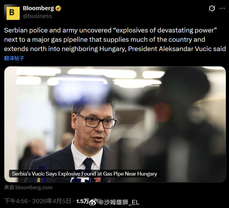 武契奇表示,在塞尔维亚通往匈牙利的天然气管道附近发现了爆炸物。