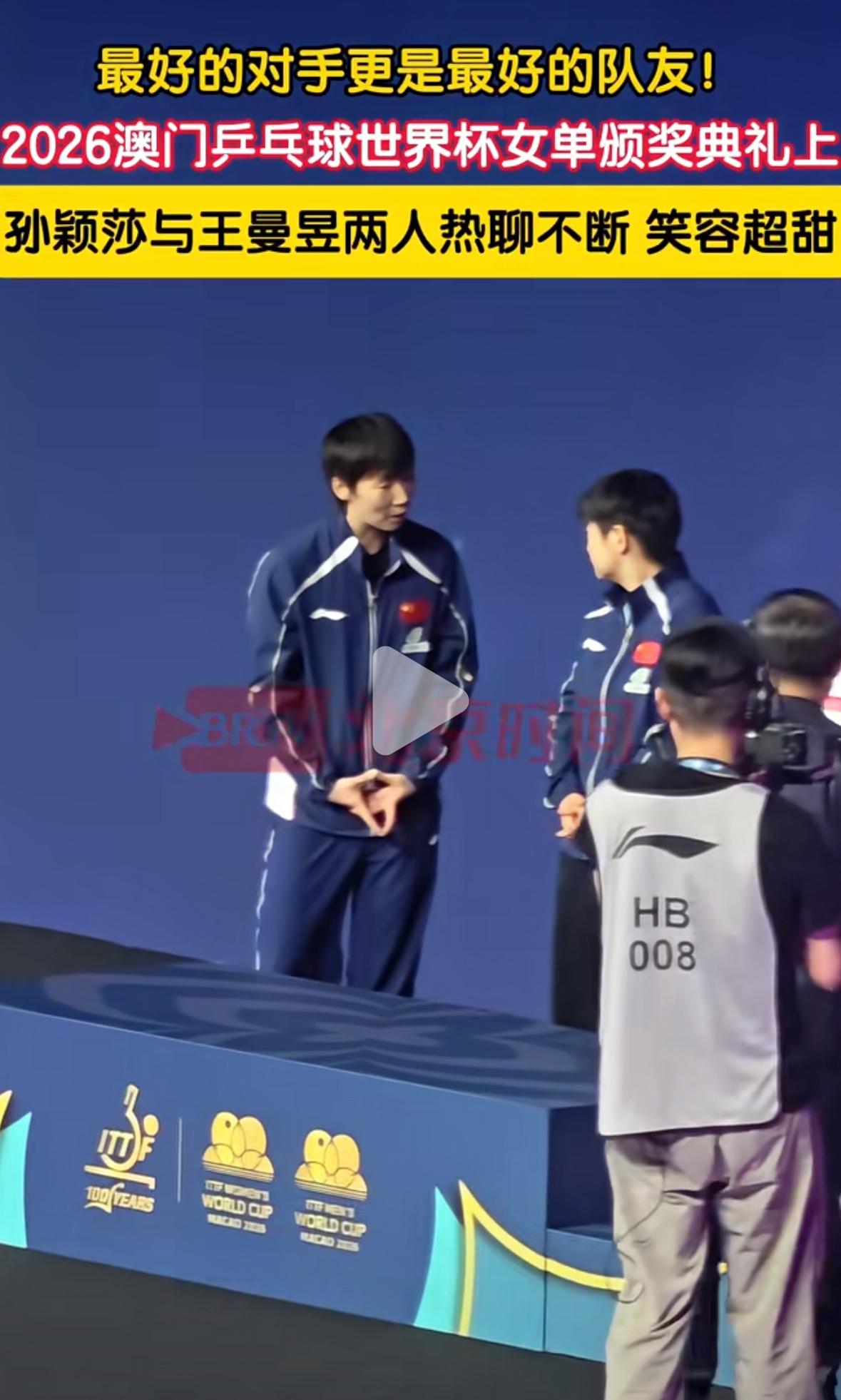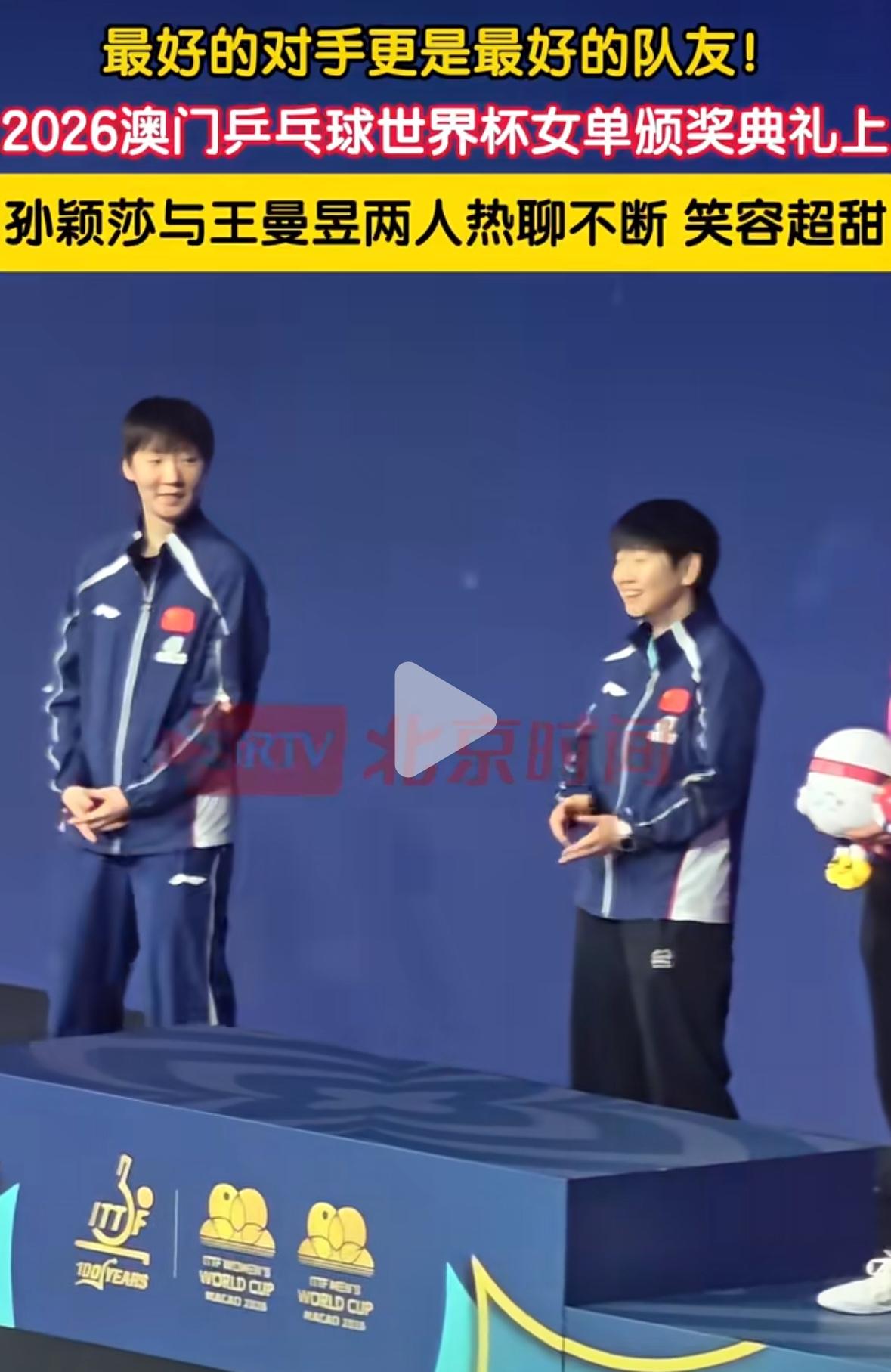 孙颖莎与王曼昱在领奖台上热聊不断—最好的对手更是最好的朋友! 澳门世界杯孙颖莎4:1王曼昱夺冠🏆,领奖台上,孙颖莎与王曼昱亲切 聊天,笑容超级治愈! 经过这次世界杯, 她俩知道,伦敦世乒赛每晚都要 确认对方在不在, 过于真实, 少一个,另一个都会像王楚钦一样, 压力山大! 所以她俩都怕对方跑了, 曼昱说过, 以后提起乒乓球, 女队就像孙颖莎 王曼昱那时候, 她们两个做到了, 真为她们感到骄傲! 我看了许昕的解说, 很喜欢他那句 “庆幸这么强的对手是 团体赛的队友!”