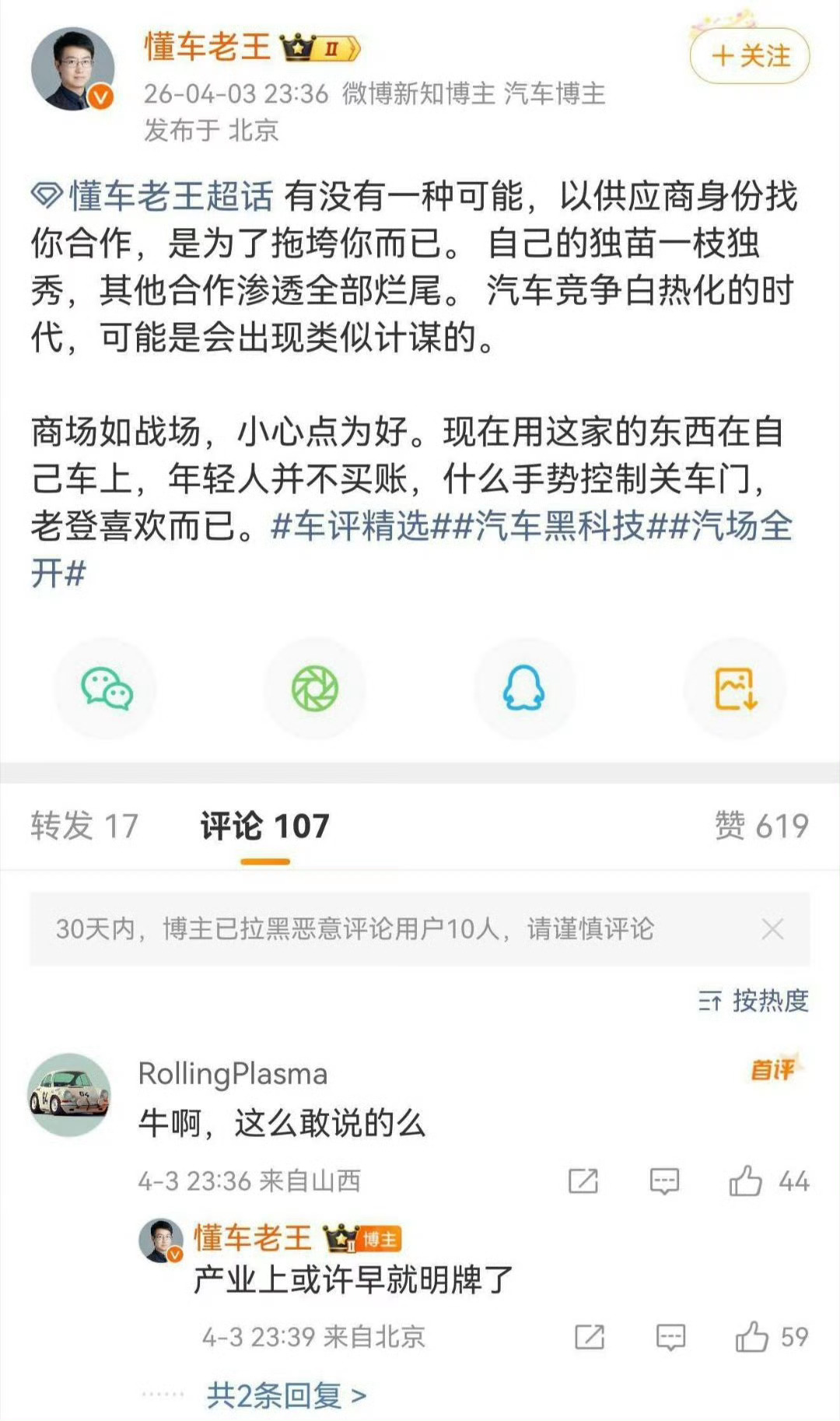 老王这是在说谁估计大家心里都有数,但是个人感觉没有这么多弯弯绕绕。自己亲自下场拖垮其他,成就独苗?这个逻辑总感觉太勉强了大v聊车