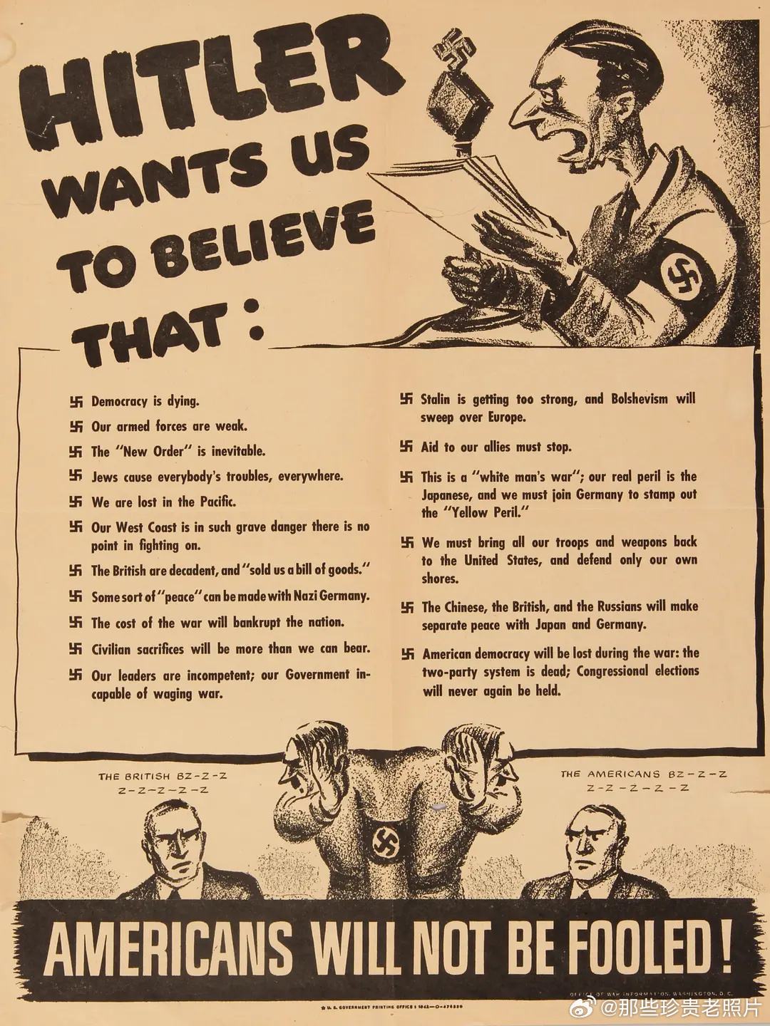 二战期间(约1942-1943年间),美国反纳粹宣传海报:“美国人不会被愚弄!”,旨在鼓励公民抵制纳粹德国的宣传。