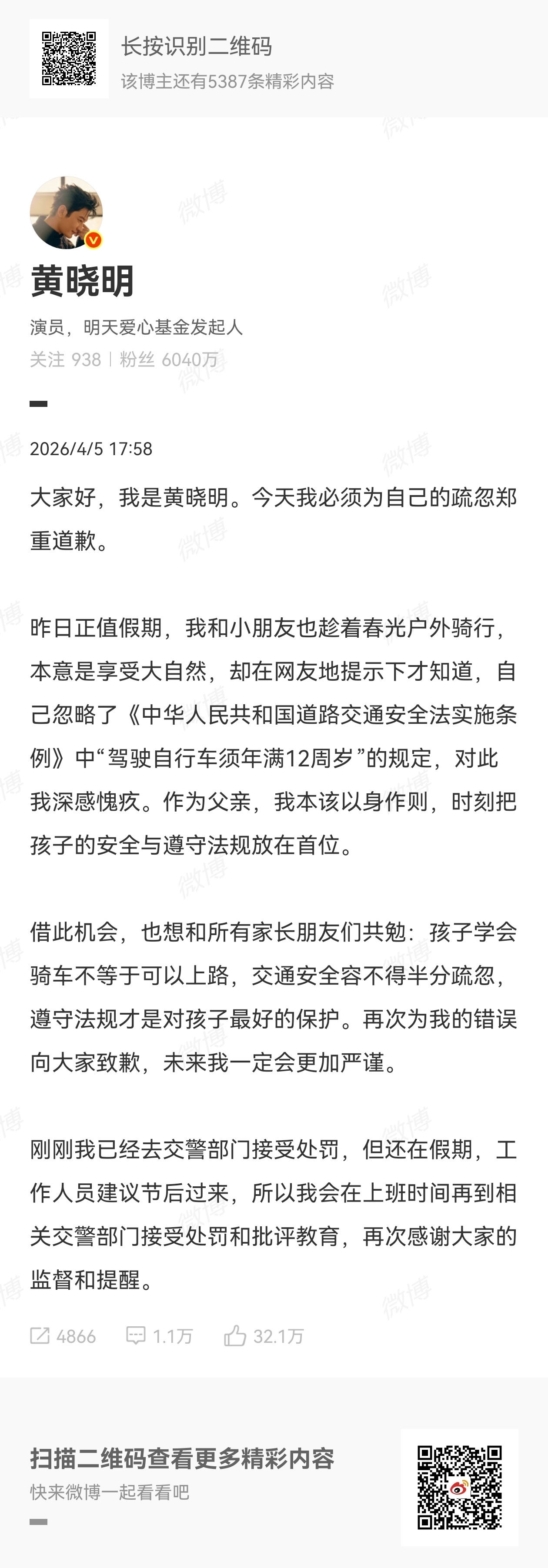 黄晓明晒和儿子一起骑车的图片,网友质疑未满12岁不能骑车上路。黄晓明就带娃骑行道歉主动去交警部门接受处罚【大概率口头批评教育】,并发文致歉。各位,你们知道这个规定吗黄晓明已去交警部门接受处罚