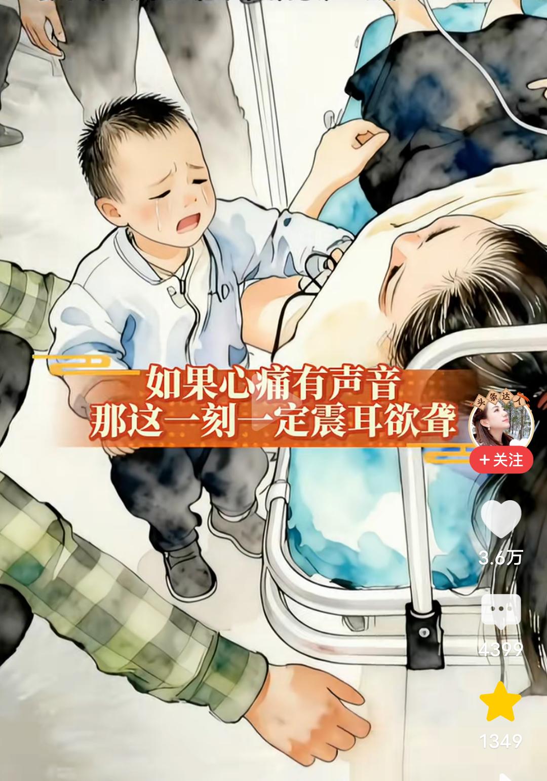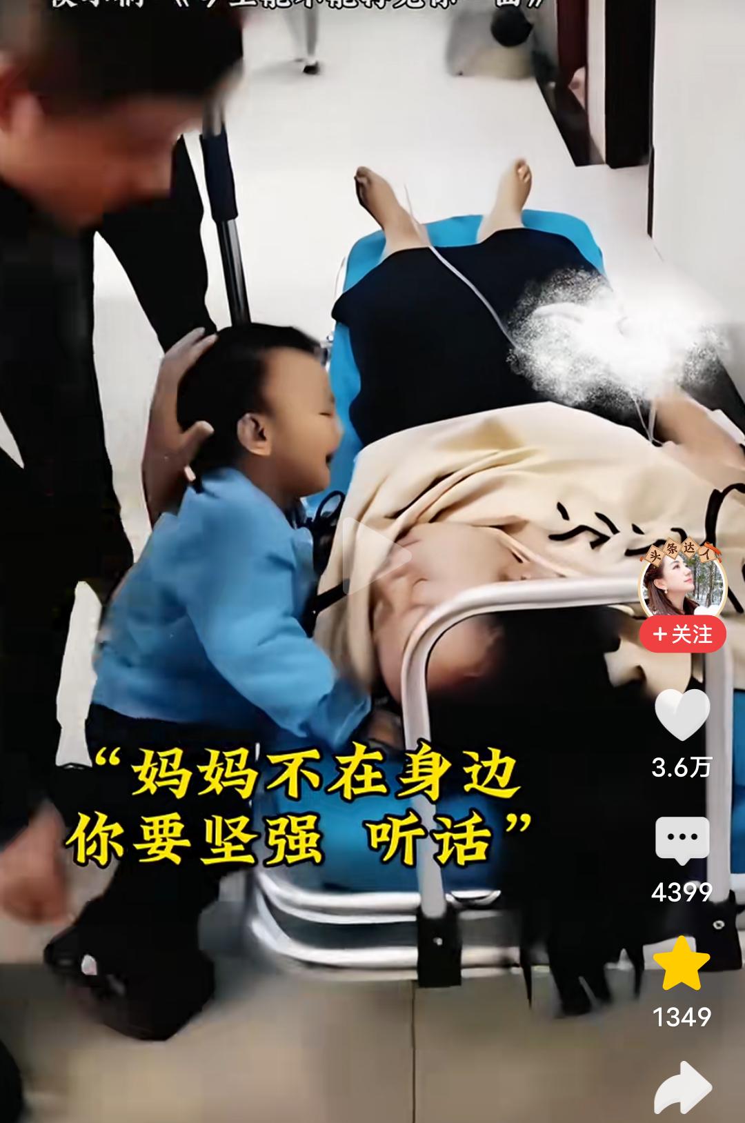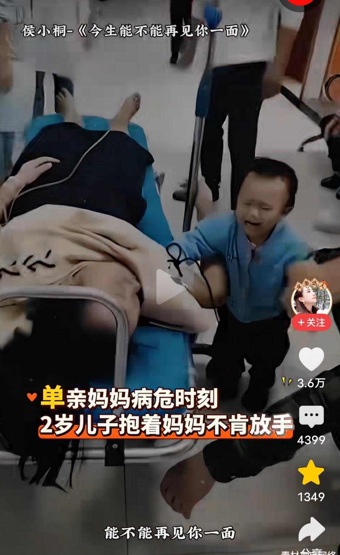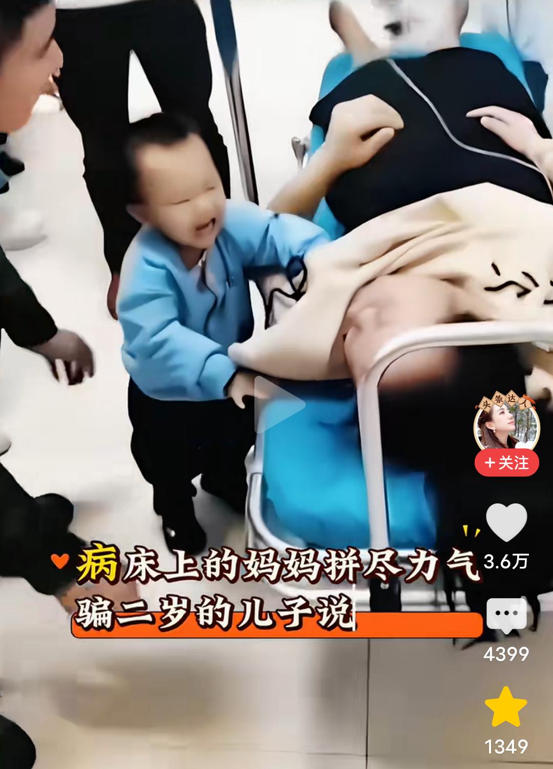 泪目!老泪纵横!如果心痛有声音,那这一刻,一定震耳欲聋! 两次刷到这个视频了,单亲妈妈病危之时,2岁的孩子抱着妈妈不肯松手,在妈妈身边一直哭喊着:妈妈不要离开我。孩子撕心裂肺的哭喊声,听的人心都碎了! 病床上的妈妈拼尽全身的力气骗2岁的儿子说,妈妈要离开一段时间去当仙女了,妈妈不在身边你要坚强,听话,妈妈会再变个样子回来看你…… 妈妈强忍着不适,搂着孩子安慰,亲吻…… 此刻,如果心痛有声音,一定震耳欲聋! 人生最悲惨的场面莫过于此,什么是生离死别,宝宝还这么小,妈妈就撇下宝宝离开人世,妈妈死也不会闭眼。 这个视频看的我是老泪纵横,妈妈不能陪你慢慢长大了,妈妈想站起来,心里想陪着你,看着你长大成人,看着你快乐健康的成长,可是,现在妈妈真的站不起来了,最舍不得放不下的就是你啊。 人生三大伤之一,幼年丧母,这深深的呼唤声,让观看此视频的观众泪流满面,太痛了。 这生离死别的场景看得人心都碎了,眼泪止不住的流…… 可怜的宝宝,往后漫长的人生,妈妈再也不能护你周全,你该直面多少波折,又该有多少个夜晚因为思念妈妈从梦里哭醒! 看不下去,真的看不下去了!