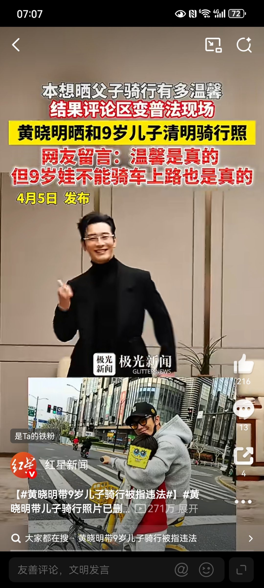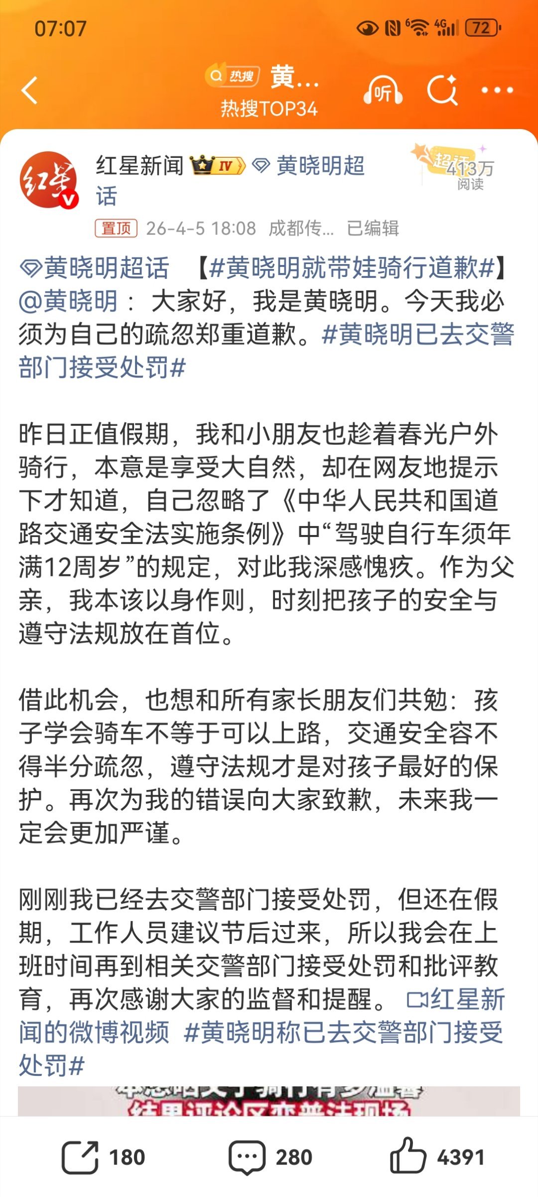 黄晓明 【黄晓明就带娃骑行道歉】黄晓明已去交警部门接受处罚4月4日,黄晓明晒出与9岁儿子街头骑行合影,因违反“未满12周岁禁止骑车上路”法规引发争议。4月5日,他发文承认疏忽,表示已主动联系交警部门接受处罚与批评教育,并提醒家长重视交通安全。黄晓明称已去交警部门接受处罚