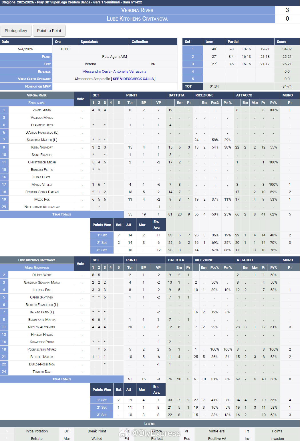 【意超男排半决赛I维罗纳零封鲁贝 尼科洛夫20分独木难支】国际排坛战报速递 4月5日维罗纳,意超男排半决赛打响,首回合维罗纳主场3-0(34-32/25-21/25-21)零封奇维塔诺瓦,在五场三胜的比赛中先下一城。MVP凯塔15分、达兰13分、莫兹奇11分,尼科洛夫20分、波托洛10分。