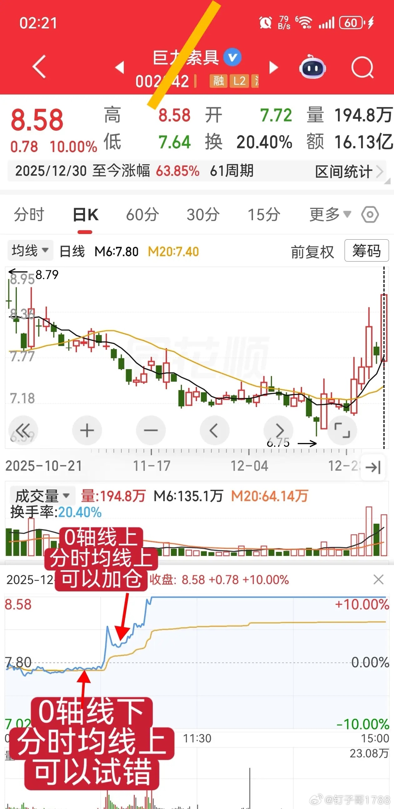 立足“稳”字当头。股市投资,稳定是长期生存盈利的基石,“稳字当头”绝非保守,而是靠系统化纪律与策略,规避情绪化交易,靠复利稳步盈利,以下八大维度构建完整稳健交易体系。一、稳定的心态。心态是交易根基,摒弃一夜暴富幻想,接受盈亏同源,不因单笔交易盈亏动摇心态,绝对信任既定规则,理性执行交易计划,杜绝贪婪与恐惧主导操作。二、稳定的战法。固定适合自身的战法,不随意跟风切换。专注强势新高追涨战法、倒车接人低吸战法,将选股、买卖点、仓位、止损细化为可执行标准,形成闭环,长期深耕提升胜率。三、稳定的选股公式。追涨型用强势新高公式,筛选股价阶段新高、量能配合、趋势强势标的;低吸型用倒车接人公式,锁定主升浪后缩量回调、企稳支撑的个股,精准匹配风格不盲目选股。四、稳定的买卖时间。买入固定早盘9:35-10:00、尾盘14:50-15:00;卖出定在10:00-10:30或尾盘时段,避开无序波动,杜绝盘中临时决策。五、稳定的盘中买点。绿盘企稳分时均线上,小仓位低吸试错;站稳0轴与分时均线上,量能健康则加仓,无符合信号耐心等待。六、稳定的卖点。短线跌破6日均线减仓,跌破启动大阳开盘价无条件清仓,严守离场纪律不恋战。七、稳定的止盈止损。设定固定亏损比例止损,盈利后分批止盈,严控风险、锁住收益。八、稳定的复盘方法。每日定时复盘交易合规性、持仓状态,拟定次日备选股与交易计划,持续优化体系。稳是交易的核心,用规则约束行为,以稳定体系应对市场变化,方能行稳致远。