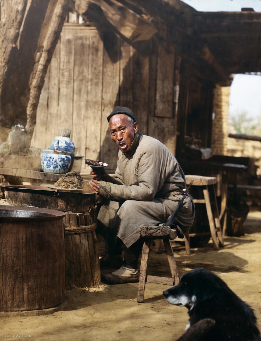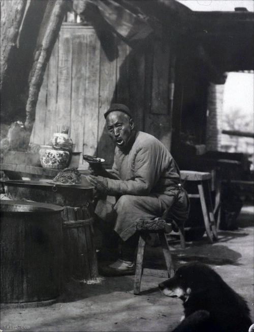 清末,北方,这位头戴瓜皮小帽、身穿粗布长衫的老汉,是这个小吃摊的经营者。他坐在摊位灶台后,手里端着碗、张嘴的神态,大概率是出摊前/收摊后,趁着没有客人,在自己的摊位上吃一口热饭。 摊位是用木杆、木板搭建的简易棚屋,仅能遮阳挡雨,没有固定门面,面前的铁锅、带花纹的瓷罐、木桶,都是北方小吃摊必备。右下角守着摊位的土狗,是摊主养的看家犬,为这张老照片添了十足的烟火气。 清末的街边小吃摊主,大多是破产农民、小手工业者,没有本钱开设固定店铺,只能靠街边摆摊谋生,收入微薄、风餐露宿,出摊时长动辄十几个小时,绝大多数人只能在摊位上随便吃一口热饭。
