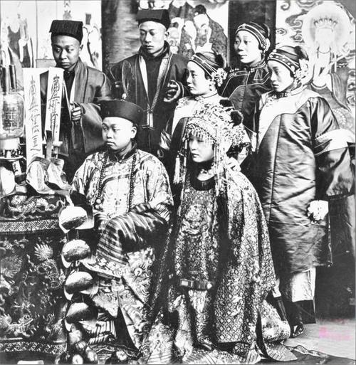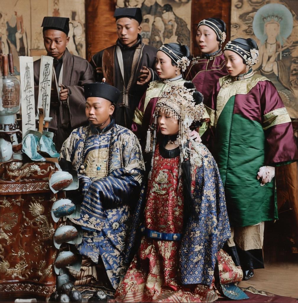 清末民初,北方旗人(满族)贵族家庭萨满家祭仪式。 照片拍摄于旗人家庭的室内神堂,悬挂着绘有佛、道、萨满多神的神幔,雕刻有龙纹的硬木供桌上摆放祭祀法器。 萨满教是满族的原生宗教,家祭是满族旗人家庭最重要的传统民俗活动,通常在室内神堂举行,由家族萨满主持,用于祈福、驱邪、祭祖、还愿。