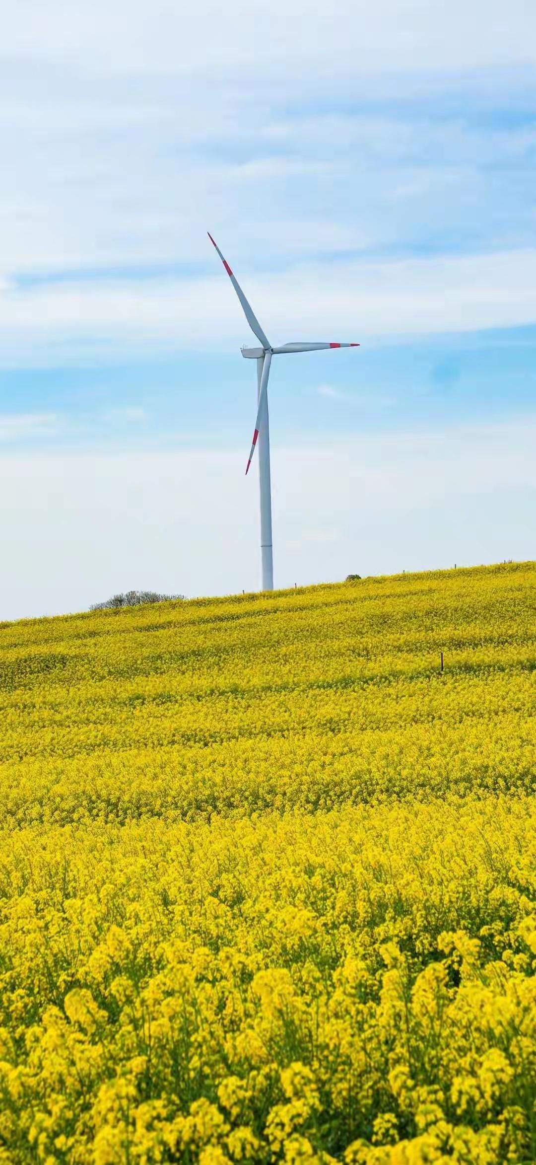 清明假期走在路上,风车矗立在油菜花田中,风景真美!