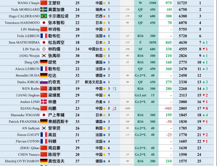最新积分排名出炉:国乒最大的希望慢慢隐现! 首先王楚钦夺冠, 积分增加了975分, 断崖式遥遥领先。 但是国乒前十, 只有王楚钦和林诗栋了。 向鹏因为仁川冠军赛积分到期, 退步8名, 来到世界17, 重进世界前十 已经非常难了。 梁靖崑下滑2名, 来到世界15, 温瑞博上升3名, 来到世界14。 未来是温瑞博、小布、松岛辉空争夺世界冠军了。