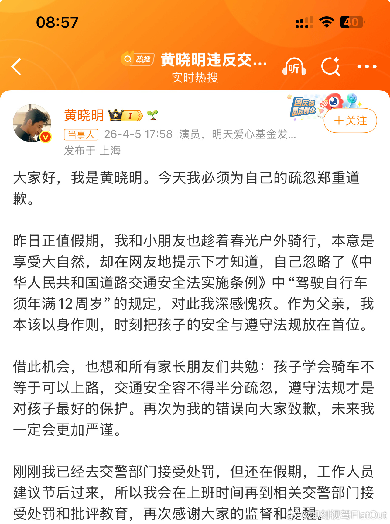 黄晓明已去交警部门接受处罚不只是明星大家都要遵纪守法呀