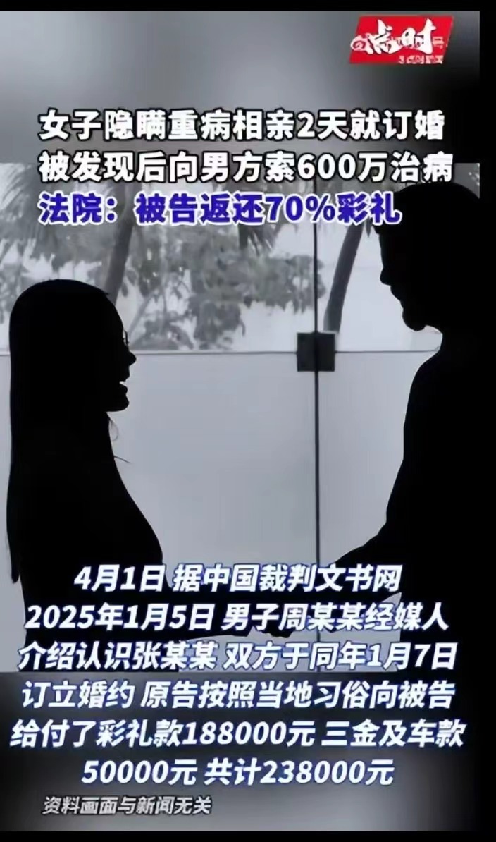太炸裂了!女子隐瞒患有尿毒症,经人介绍与男子相亲两天后订婚,男方给了238000彩礼,婚后女子要求男方贷款600万给她治病,被拒绝后拉黑对方。法院:女方返还70%彩礼!网友:判返还70%的依据是什么?这跟诈骗有什么区别?